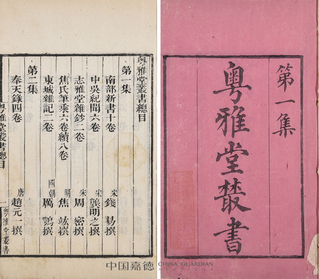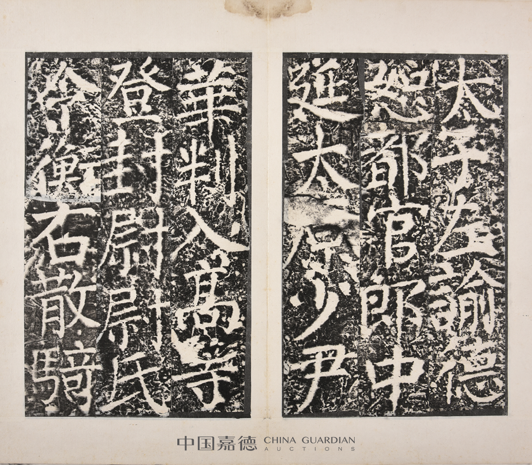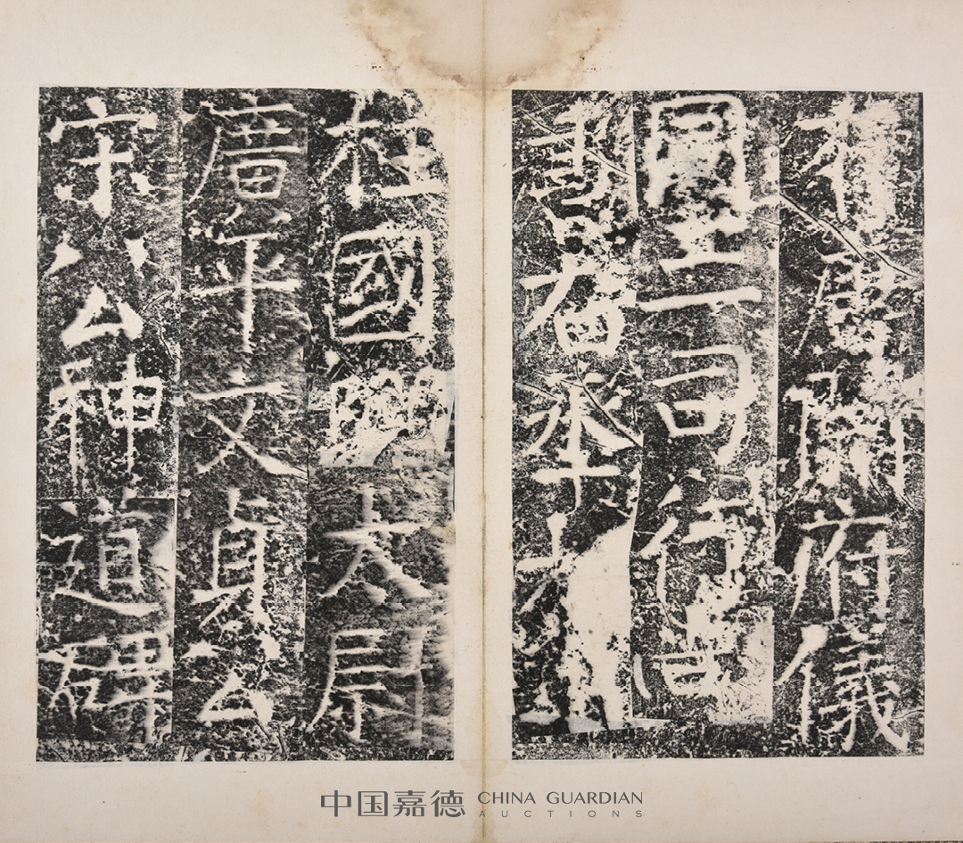 “古籍文献 金石碑帖”专场选取历代古籍文献、金石碑帖62件。古籍方面,清同治间刻本《粤雅堂丛书》三十四种,汇辑魏至清代著述,为清末最有影响的综合性大型丛书。金石碑帖方面,周多友鼎铭文存字278字,为现代出土青铜重器,《唐宋璟碑并碑阴及两侧》据册内考据,应为道光间拓本,为颜真卿楷书精品。此外,近现代名伶剧照亦蔚然可观,如高百岁、产保福签赠剧装,1963年马连良、张君秋、裘盛戎等赴香港演出《赵氏孤儿》、《秦香莲》剧照等,均为梨园之片段。