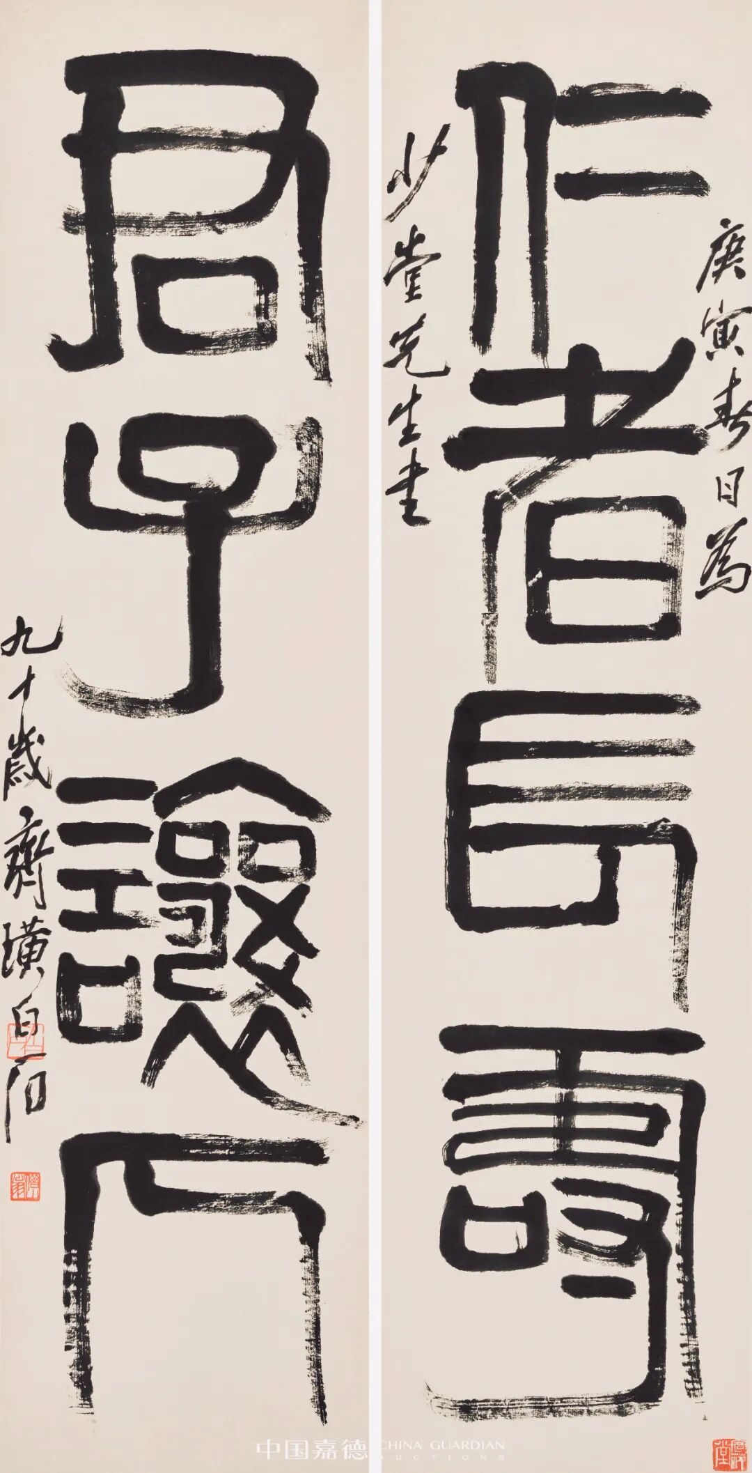 参考图:齐白石《篆书四言联》,中国嘉德2017秋季拍卖会第287号,成交价690万元。