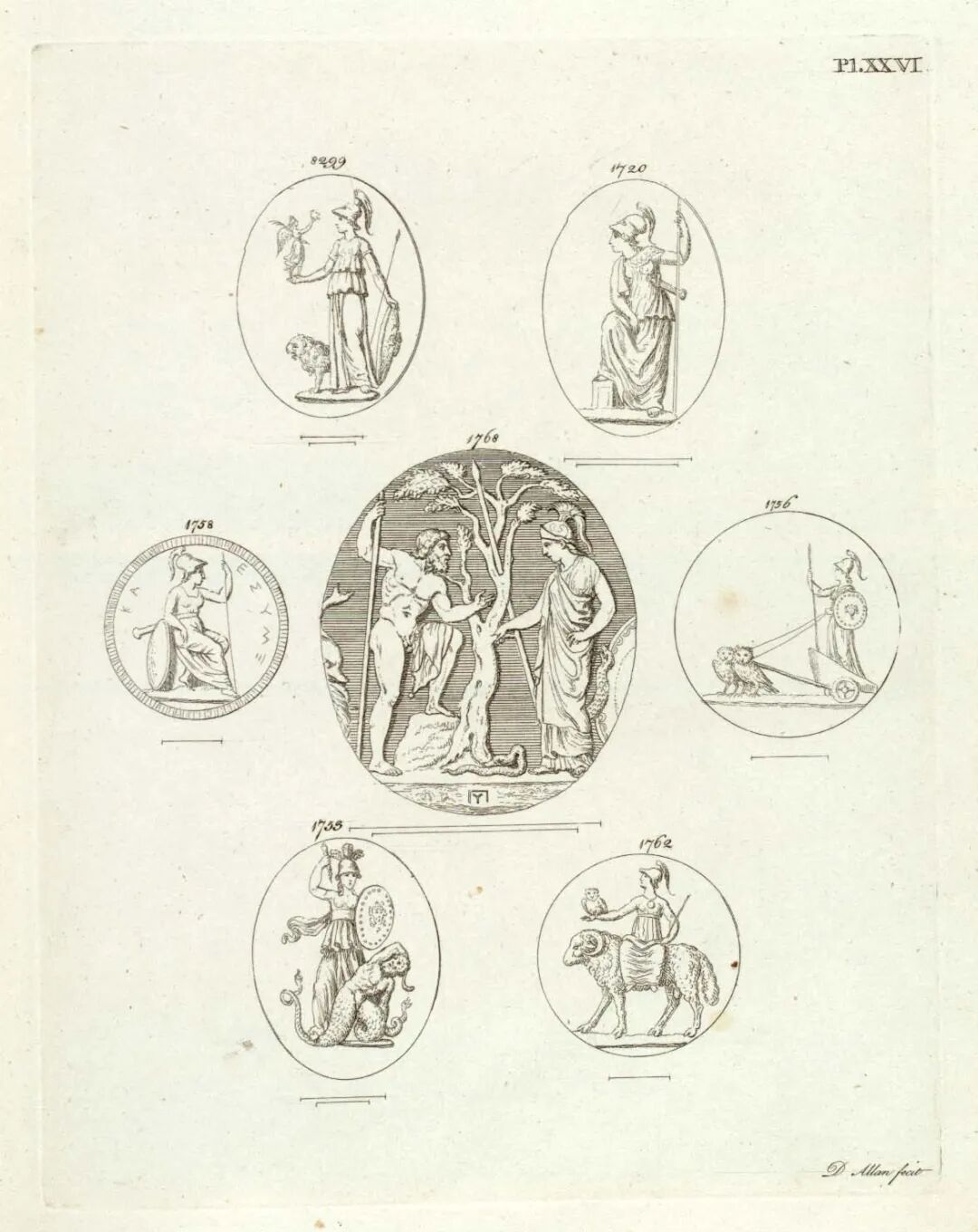 大卫·阿兰绘制的版画,展示了英国著名古物学者查尔斯·唐雷收藏的微雕宝石,后者也是塔西的主顾之一