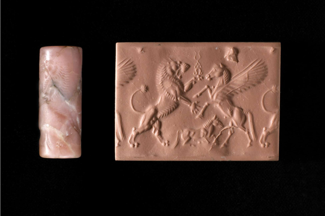 两河流域玛瑙滚印,中亚述时期(公元前1300年),动物搏斗场景,大英博物馆收藏