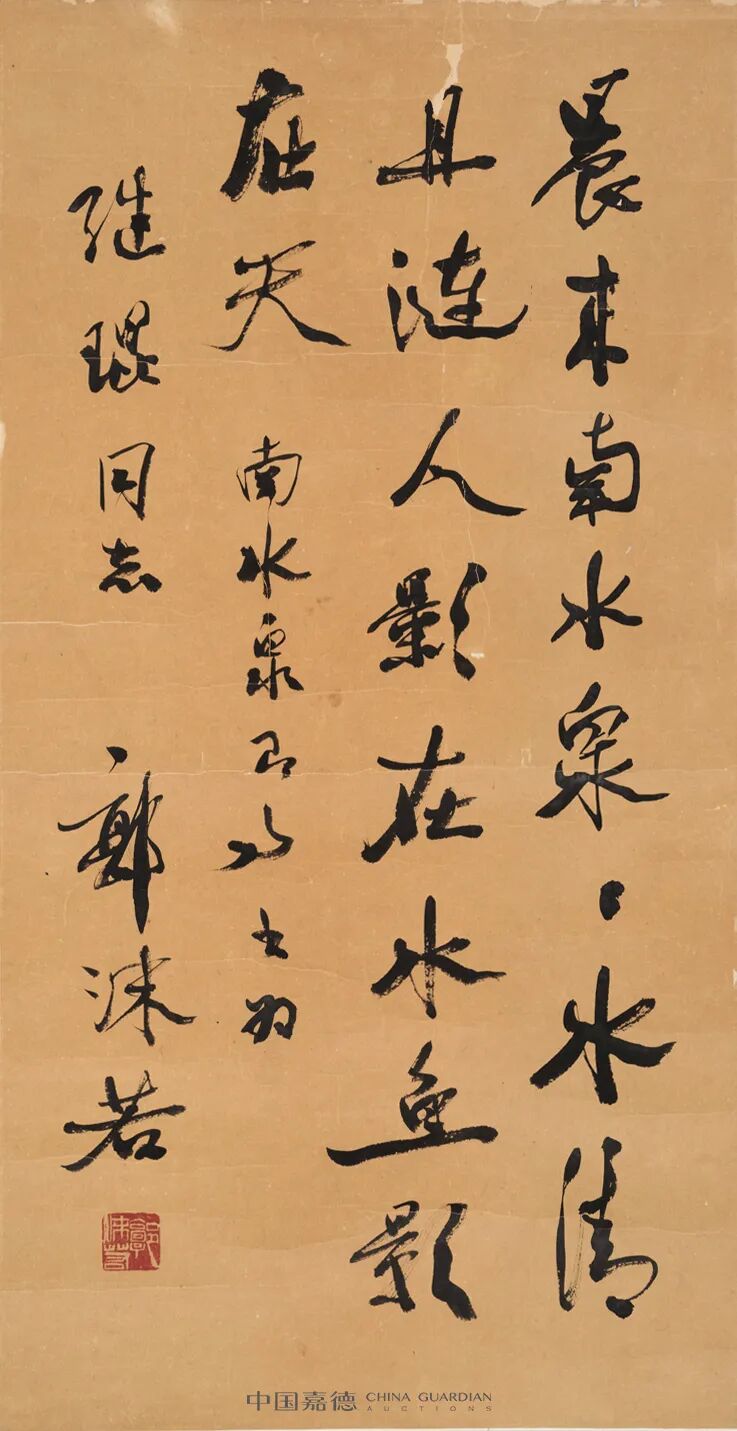 题识:晨来南水泉,泉水清且涟。人影在水,鱼影在天。南水泉即事。书为继琨同志。郭沫若。