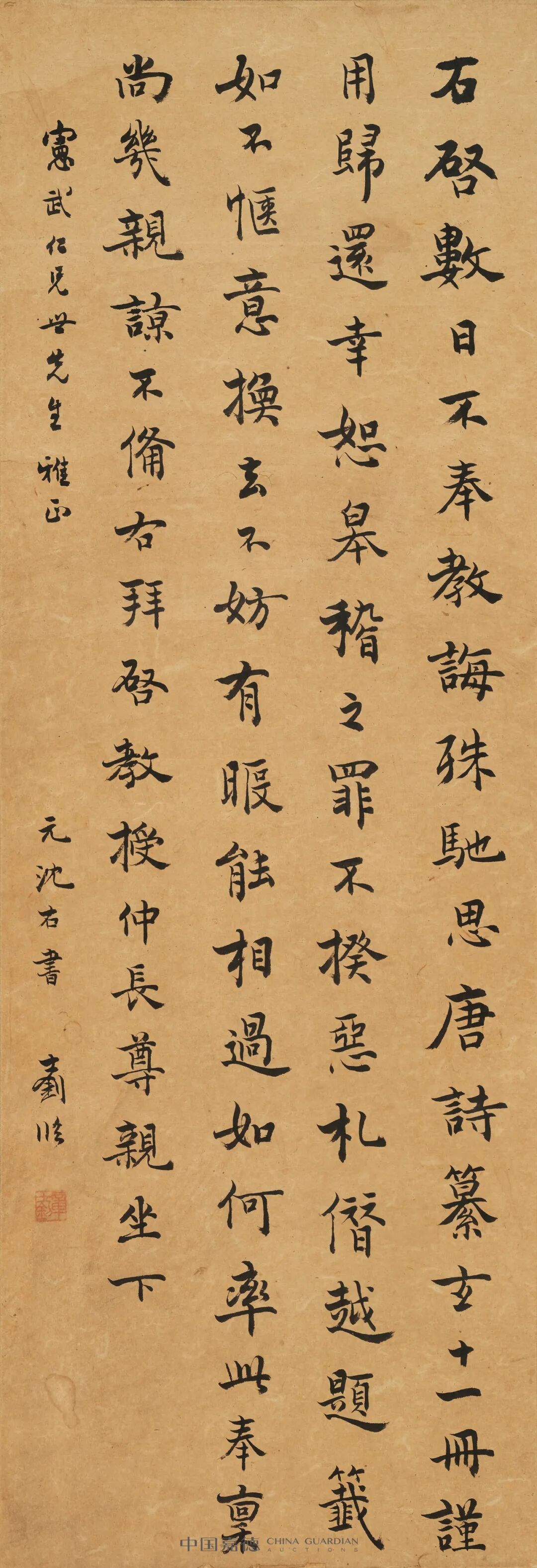题识:右启,数日不奉教诲,殊驰思。唐诗纂玄十一册,谨用归还,幸恕皋稽之罪。不揆恶扎。僭越题签。如不惬意。换去不妨。有暇能相过如何。率此奉禀尚几亲谅不备。右拜启,教授仲长尊亲坐下。宪武仁兄世先生雅正。元沈右书。士钊临。