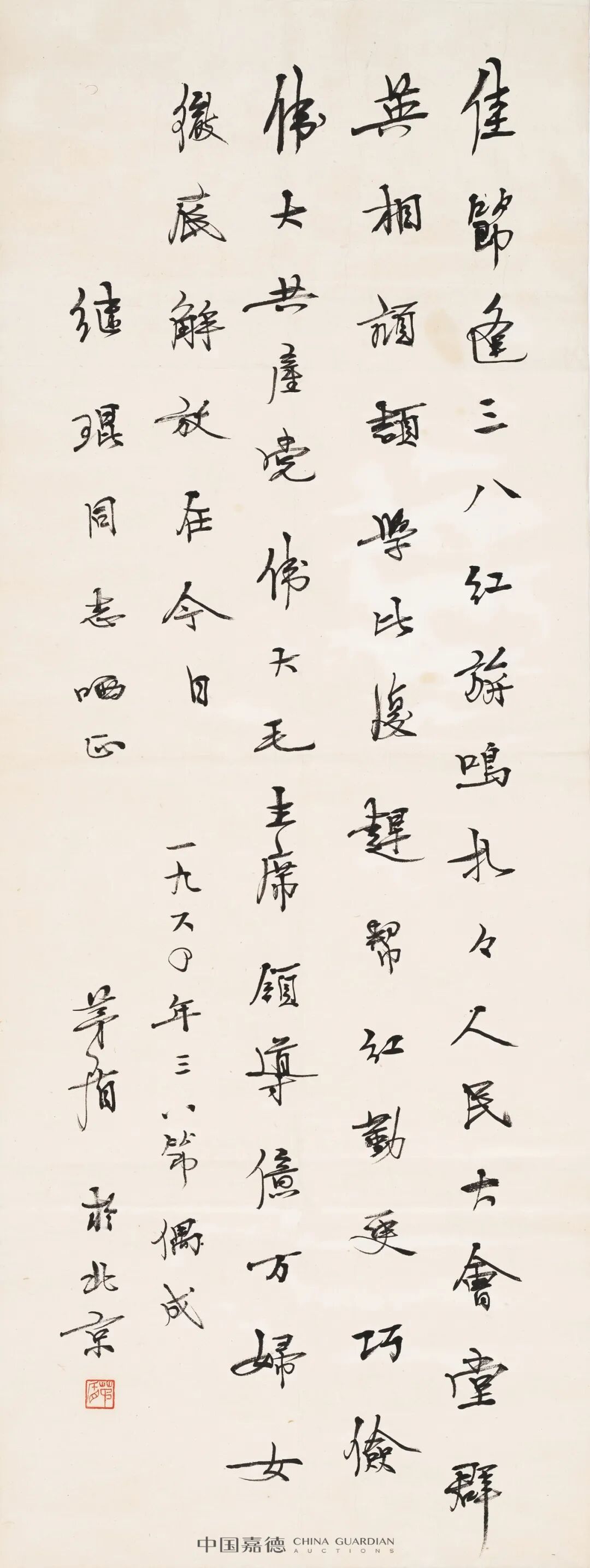 题识:佳节逢三八,红旗鸣扎扎。人民大会堂,群英相顾颉。学比复赶帮,红勤更巧俭。伟大共产党,伟大毛主席。领导亿万妇女彻底解放在今日。一九六〇年三八节偶成。继堒同志嘱正。茅盾于北京。