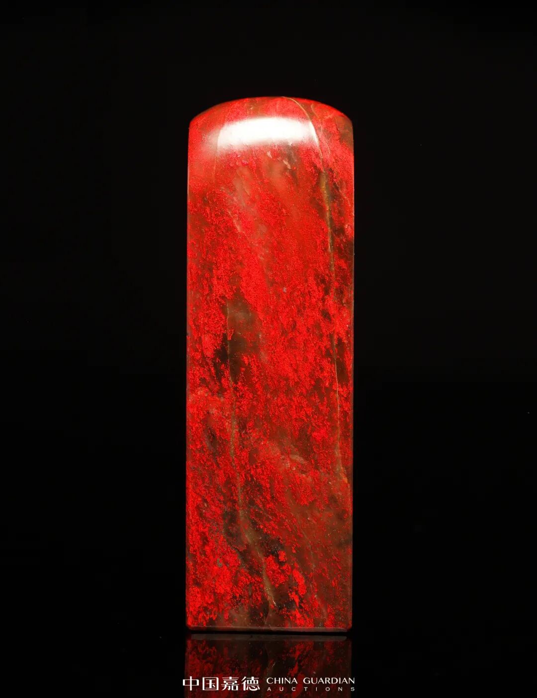 此件昌化鸡血石章,章体方正素雅,形制大而规整,造型自然圆顶,鲜红色鸡血自上而下、自内而外绵延不绝,似大雨滂沱,浓丽鲜活。