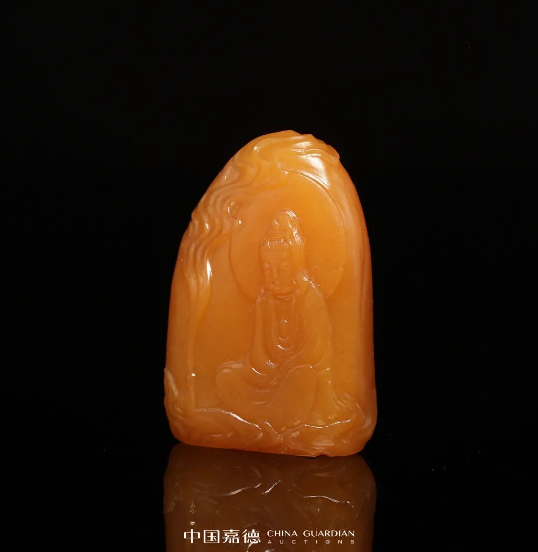 此件寿山田黄石质地莹润细腻,色黄似橘皮。作者薄意雕观音,所作观音面容慈善,双目微垂,盘坐禅定,神情娴静温婉。身前玉净瓶仙气氤氲,竹簧掩映。