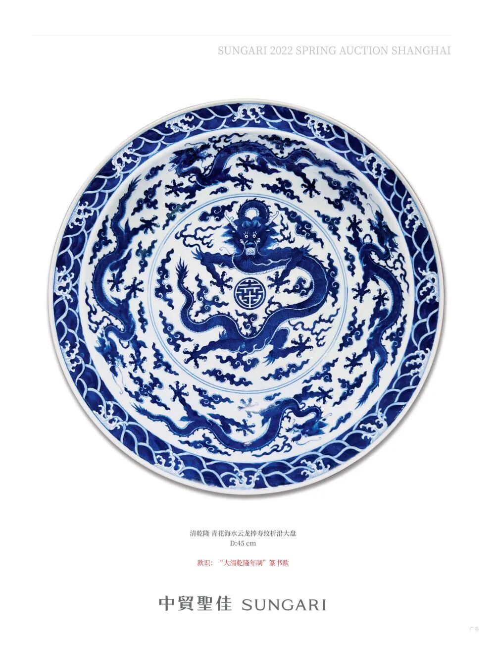 如Lot2040清乾隆粉彩婴戏图碗一对,拍品造型纹饰与底款皆与故宫博物院藏清乾隆粉彩婴戏图碗相同,以婴戏为主题,寄托了古人祈求子孙繁衍昌盛的美好心愿,也让人于无声之处感受到无限的童真。Lot2007清道光慎德堂制青花海水云龙纹瓶即为道光朝御窑立件,龙纹绘制飘逸威猛,底署“慎德堂制”款,慎德堂为道光帝行宫,可见此为帝王赏玩之器。又如Lot2035清乾隆青花海水江崖云龙捧寿纹大盘,器身硕大,青花发色艳丽,外绘四组飞云腾龙,盘心绘五爪捧寿立龙捧,含祝寿之意,应用于皇宫席宴及特定隆重之祝寿场合,同属罕见之官窑极品。