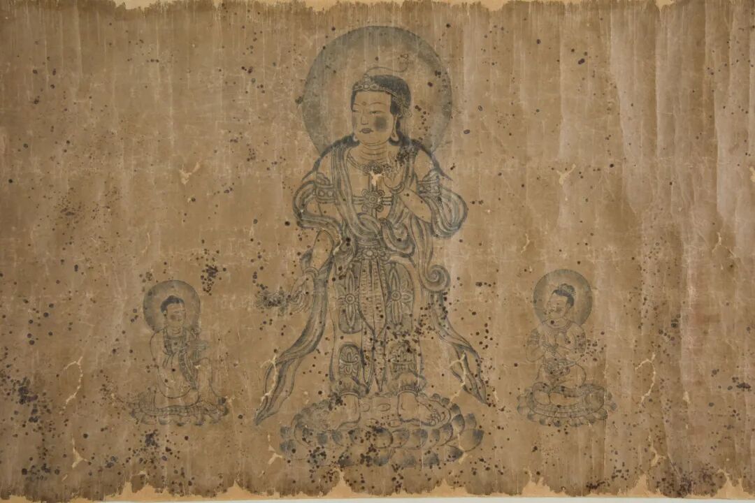 本写经者荀勗,三国时代魏至西晋政治家,字公曾。幼承家学,十余岁时,因聪颖博学而得从外祖父钟繇称赞其有曾祖父荀爽之风范。荀勗精于音律,博通文学、古文字学及目录学,擅长书法,精于绘画,也是虔诚的佛弟子。他著有《中经新簿》,开创奠定了佛教典籍进入国家藏书着录体系的先例。于是,可以遥想见,这位「光禄大夫尚书令领秘书监佛弟子」荀勗,在公元281年太康二年天下初定的辛丑八月十五日,于秋澄万景清和之良辰,运气凝神,「沐手敬写」了这卷《佛说陁罗尼经》,并且以一位典型的魏晋名士文人的风雅笔法,纯用墨法精谨绘制了释迦牟尼佛与二弟子卷首画。冀以此完整一卷为祷,实现天佑万民、国祚永泰的善愿宏景。