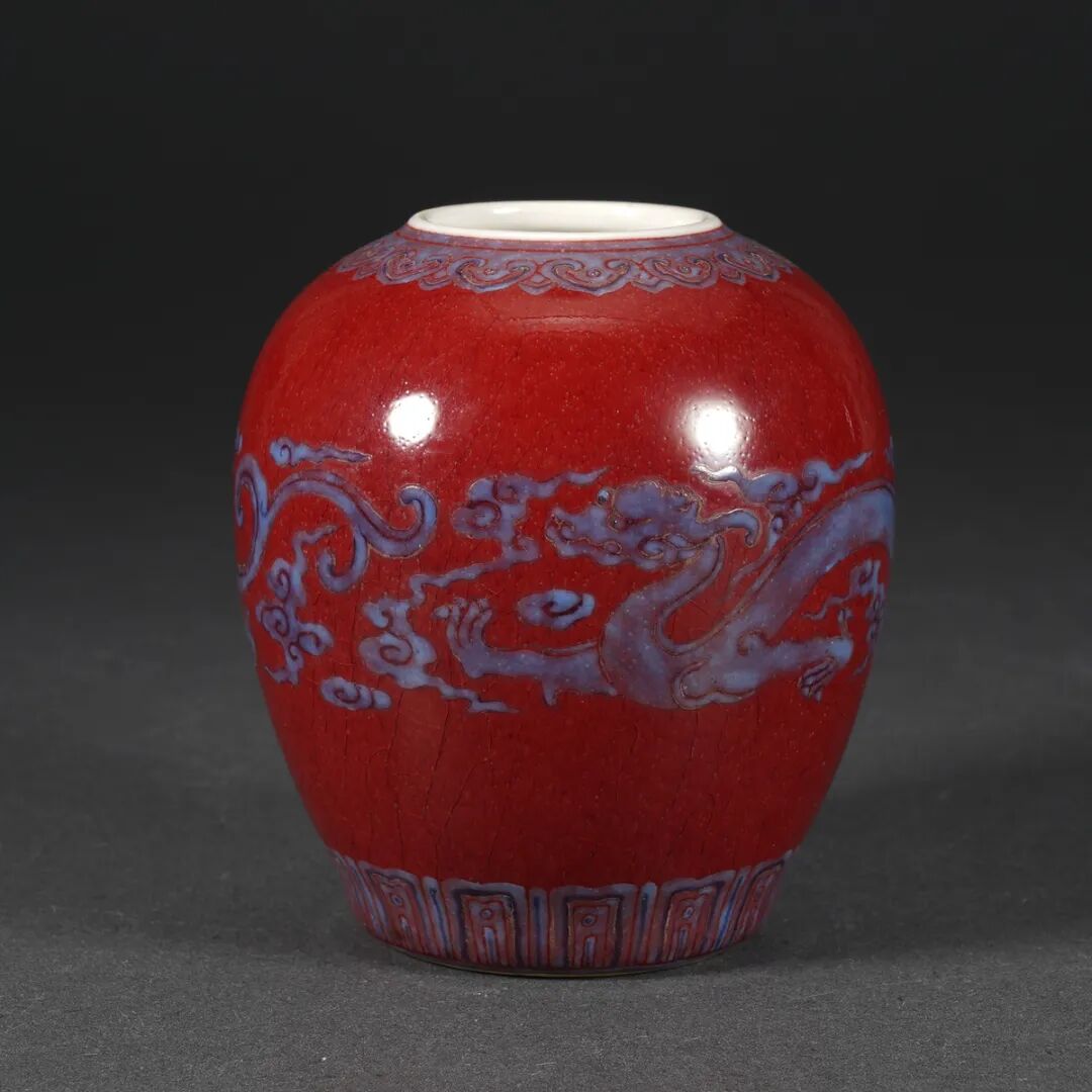 清·红釉堆蓝料龙纹小罐