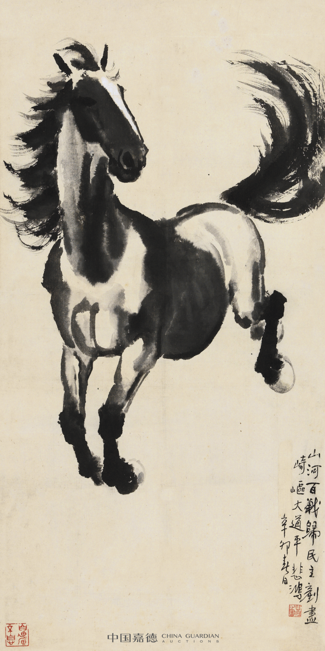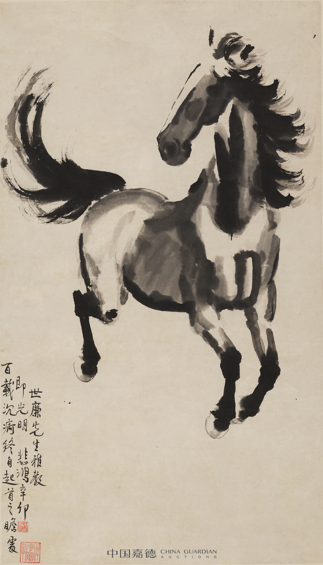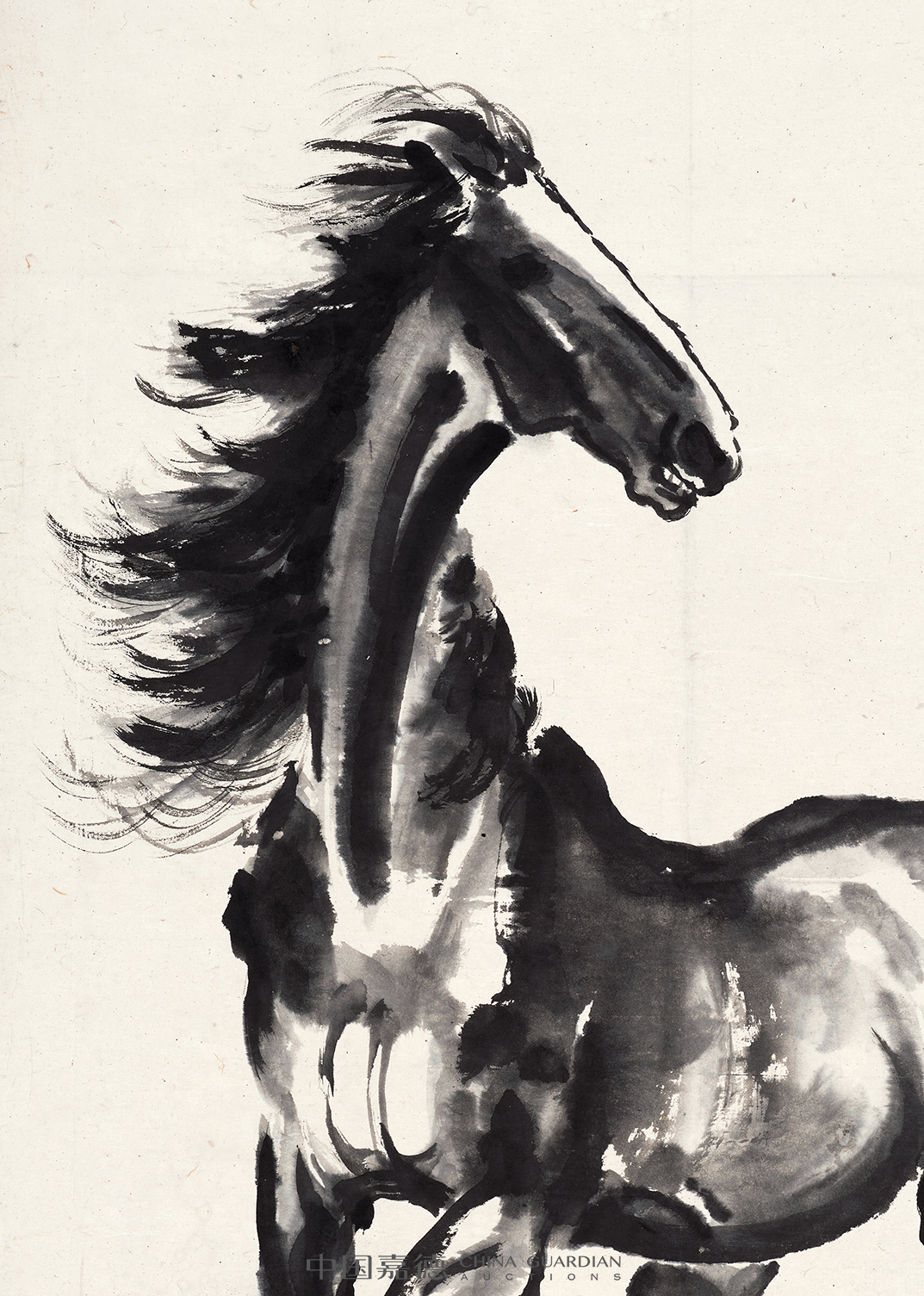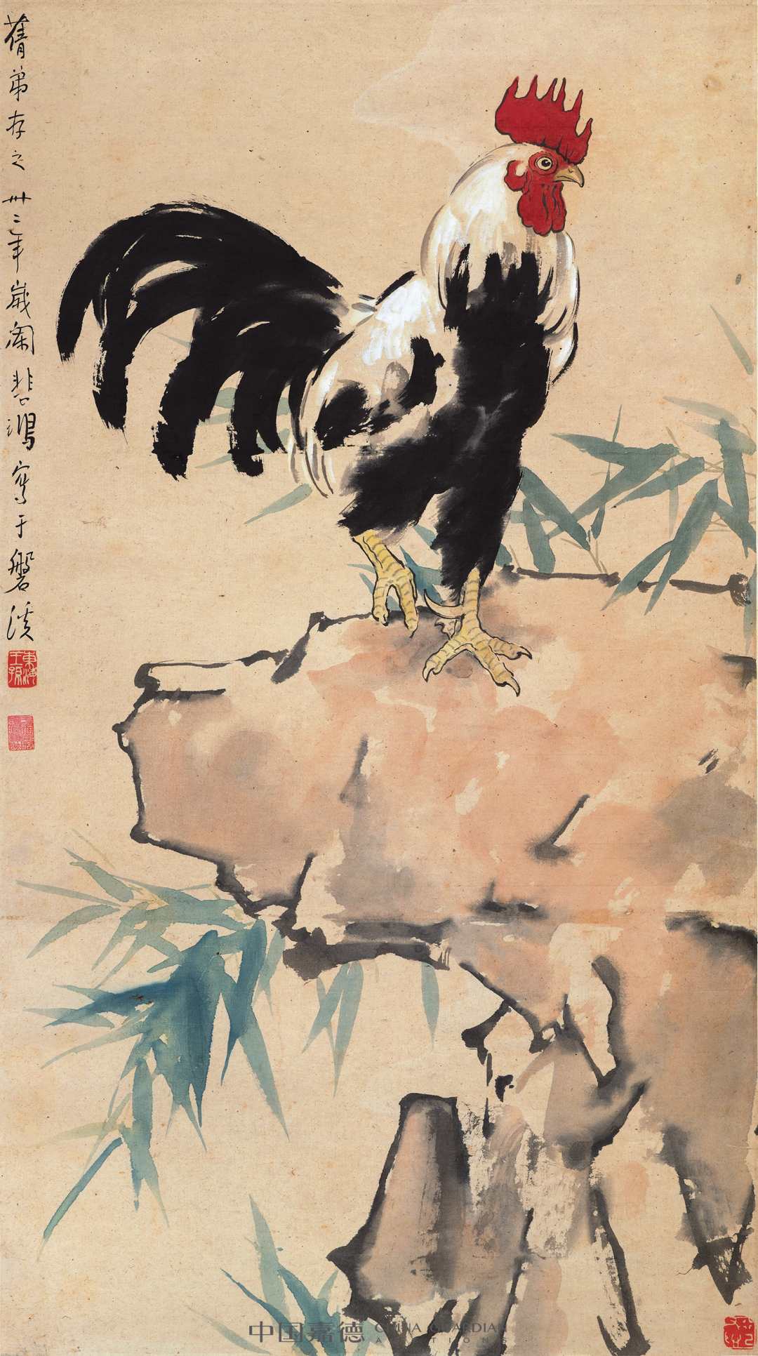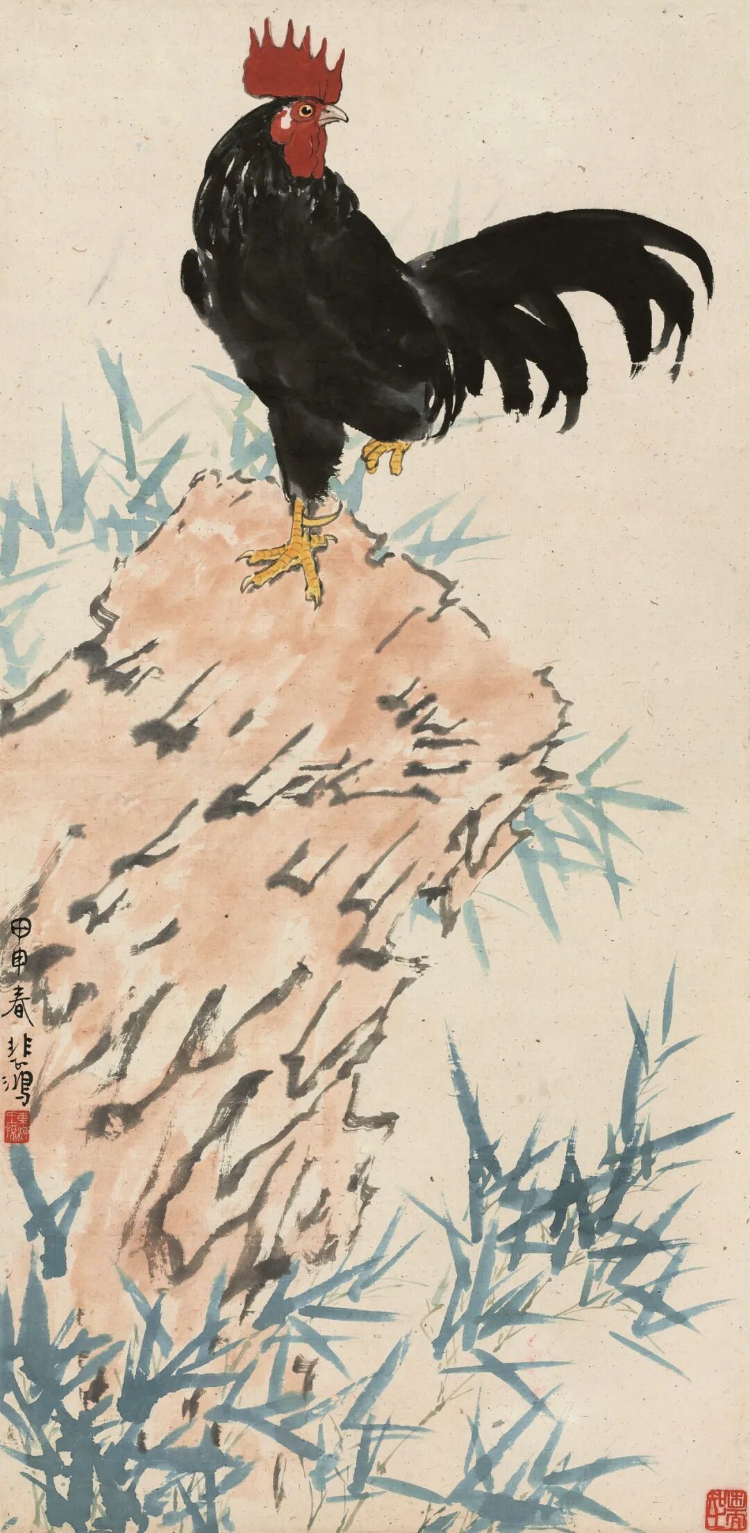 本季大观夜场,我们将推出雄鸡、天马共四件徐悲鸿的动物画力作,分别为赠弟子张蒨英的《平安大吉》、赠好友罗寄梅的《立马》、原藏徐悲鸿纪念馆的《山河百战归民主》和政界要员谭启龙先生旧藏的《奔马》。四件作品均为徐氏成熟时期创作,形神兼备、自创一格,能够寄情寓兴、喻射时代,是徐悲鸿对造化之妙与文心之思的深潜探索。