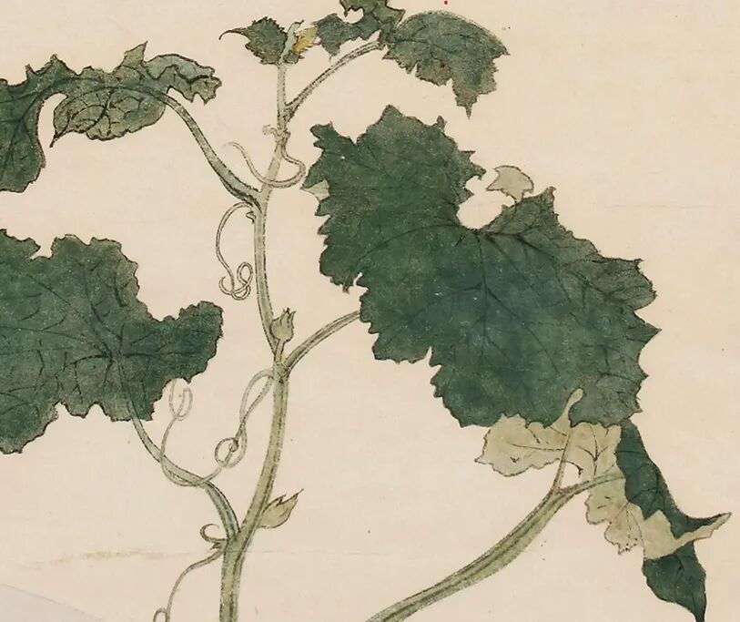 画家以工细之笔勾一瓜藤,仅取局部,犹如特写镜头,令人细细品味赏玩。只见画面中藤线如舞,生长自由而舒展;阔叶飘摇,舒卷掩映,赋色轻清,叶色之嫩老,传神毕肖;秧蔓缱绻回转,勾线细秀,藤曼及阔叶上勾出细长的叶茎、叶脉,增加了画面线条的组织变化,行笔流畅而潇洒,于淑静中给人以生机勃勃的意态。藤上结一硕果,正有吉祥的寓意。