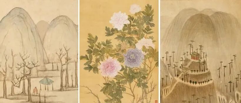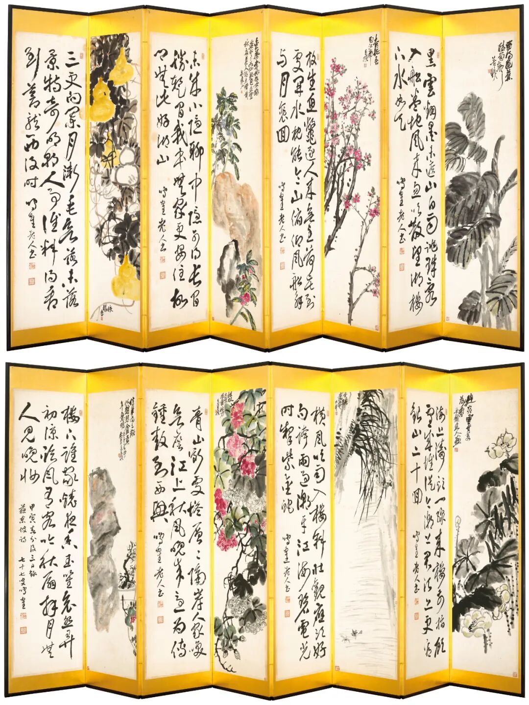 ■ 奉文堂旧藏齐白石 名迹佳作;比利时东西轩旧藏张大千于1960年代所绘的泼墨山水《烟云放棹》 及《墨荷》 ;来自日本私人收藏,结合了吴昌硕及日本书道大师日下部鸣鹤的《花卉书法屏风》。