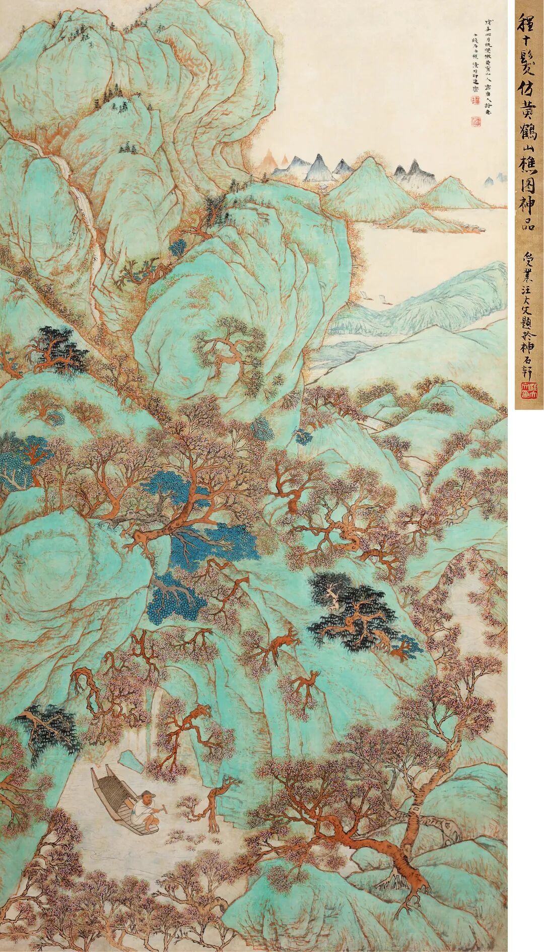 题签:王玄照仿赵千里青绿写东坡诗意图真迹。仲麟兄珍藏,丁亥八月,吴湖帆题。