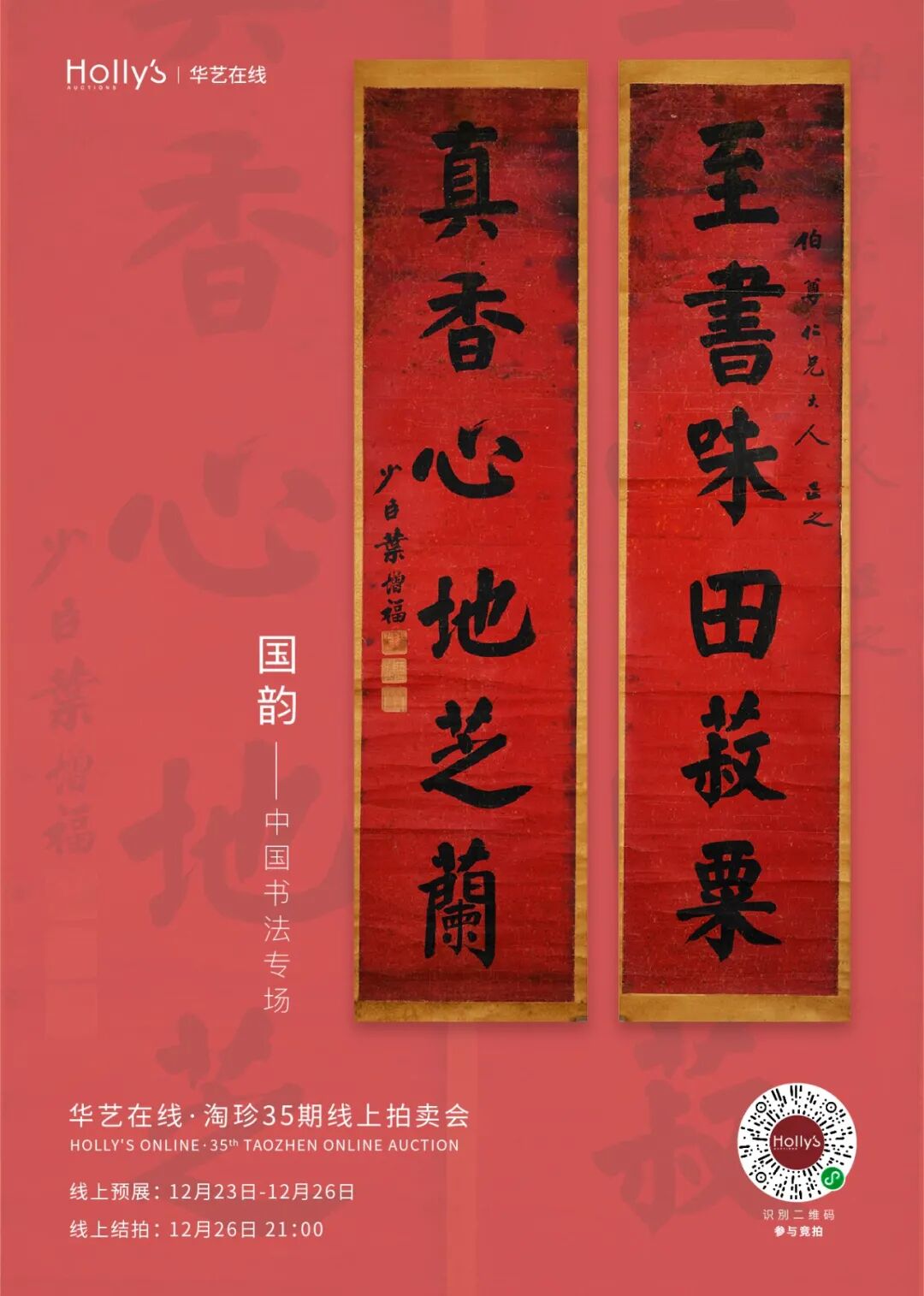 每到年末总免不了盘点和回望,用各异的方式来记录岁月、留住光阴。时间匆匆,让我们抓住十二月的尾巴,并祝福即将到来的新年吧。华艺在线始终相伴,淘珍35期线上拍卖会——中国书画板块集中呈现佳构120余件五大专场,既涵盖来源明晰、品质上乘的“望云庐”收藏佳构,又有诸家荟聚之法书,和刘斯奋书作专题,以及包罗万象的翰墨掇英(一)(二)等丹青妙韵。次日起,网络展拍同步开启,四天竞价不停歇!