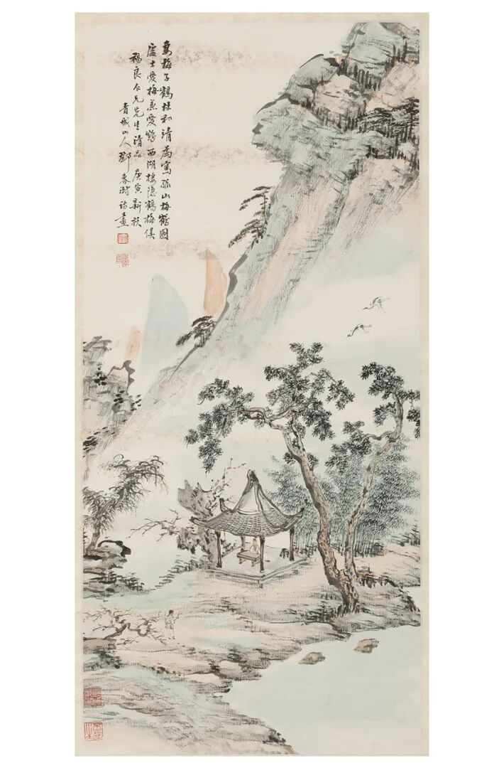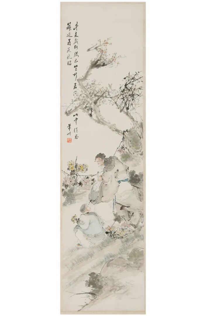 “掇英——中国书画”专场(二)臻聚清以来及至近现代名家作品近五十件,甚为可观。辑中山水,诸如溥儒《江边放歌》、邢鸣盛师烟客笔意扇画、徐昌熙仿宋人法之浅绛、吴石仙拟米友仁笔法《溪山烟雨》等。人物画方面,笔耕作采菊图,可谓意笔生风;周祖荫之百子图,意趣盎然;费以耕《仕女》,形神兼备。花鸟皆善,陈文锦、李卜五、毛延恩诸家有所呈现。此外,云竹、诸秋健、申石伽、邓春澍、沈焯等艺家佳作亦不容错过。