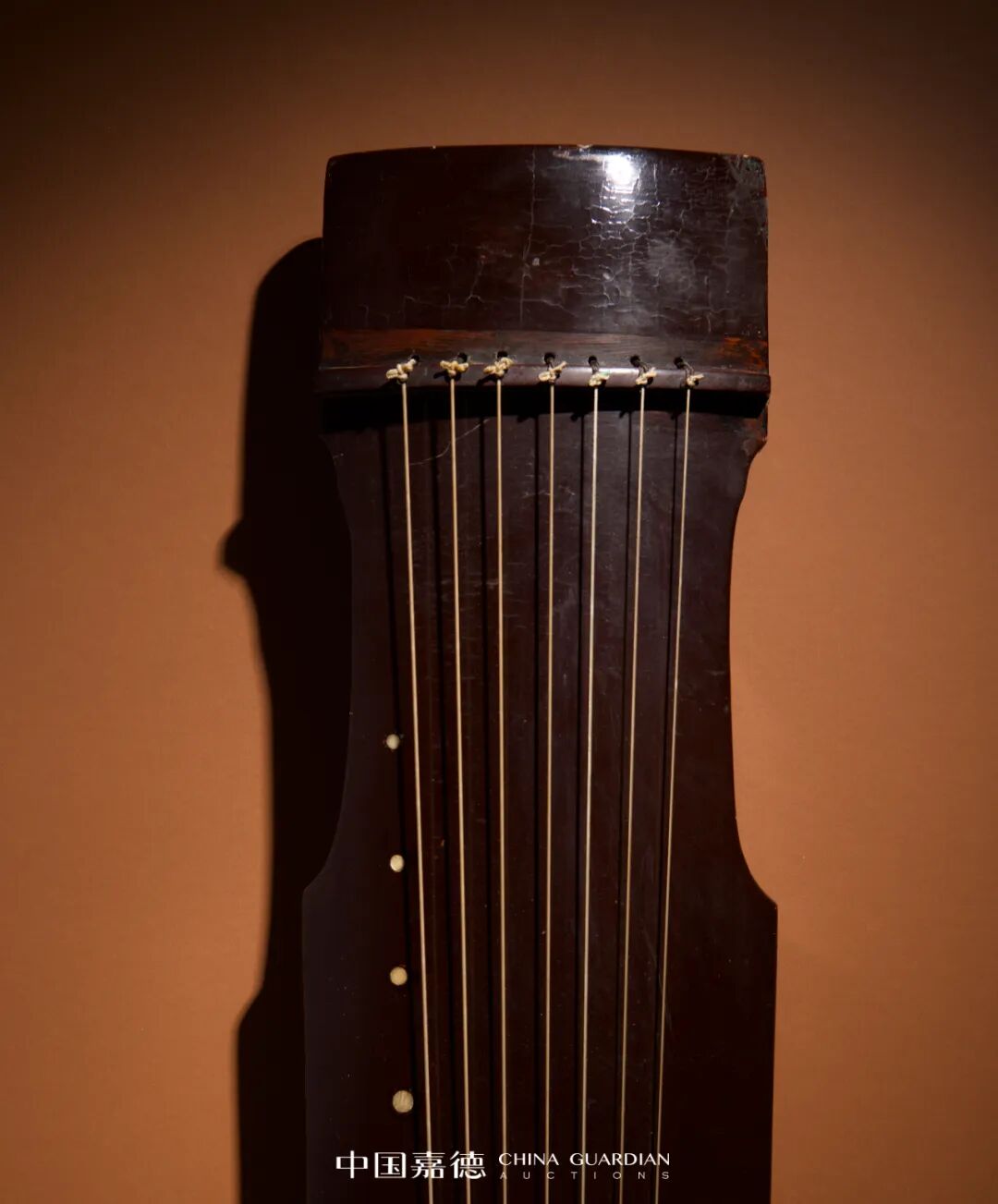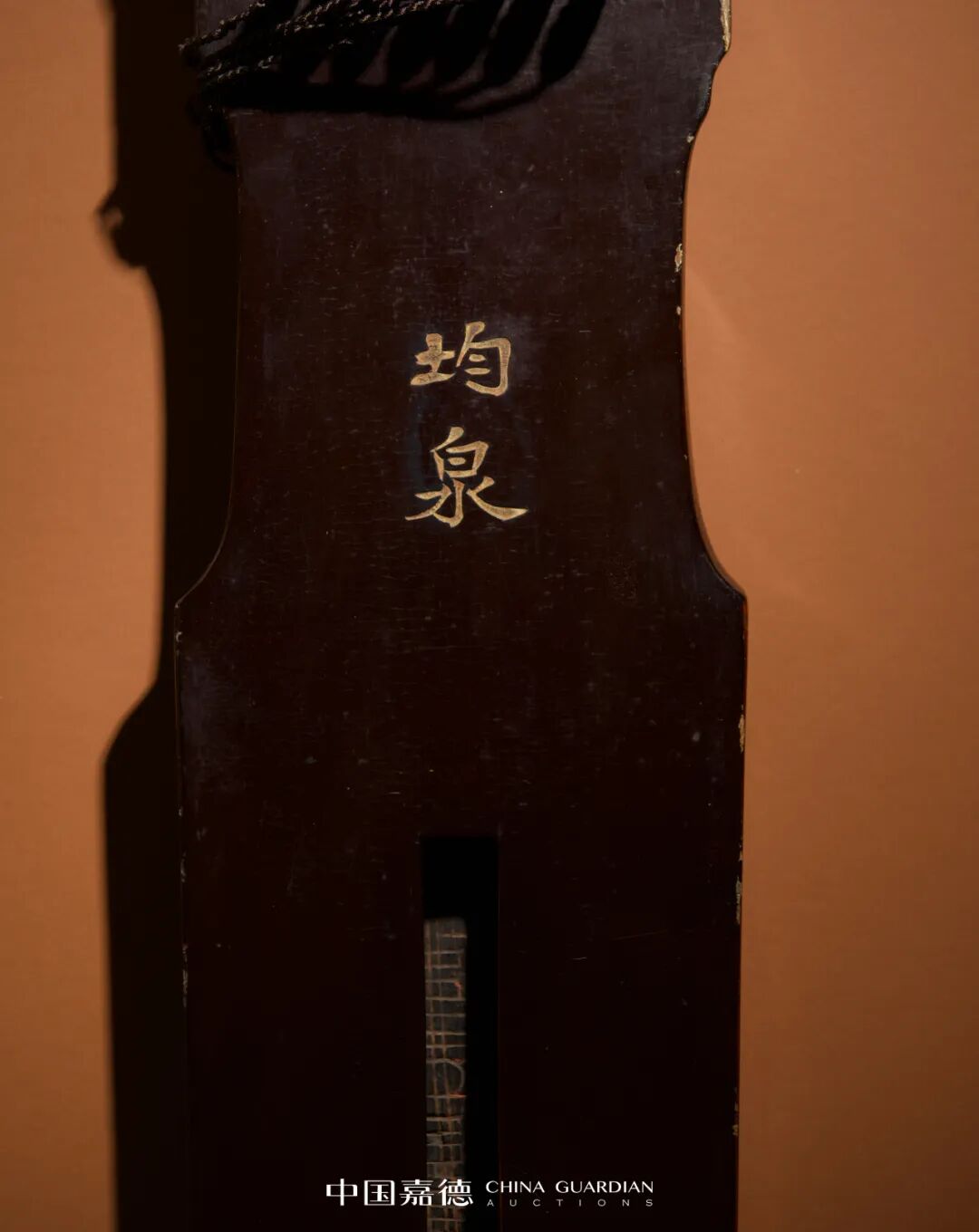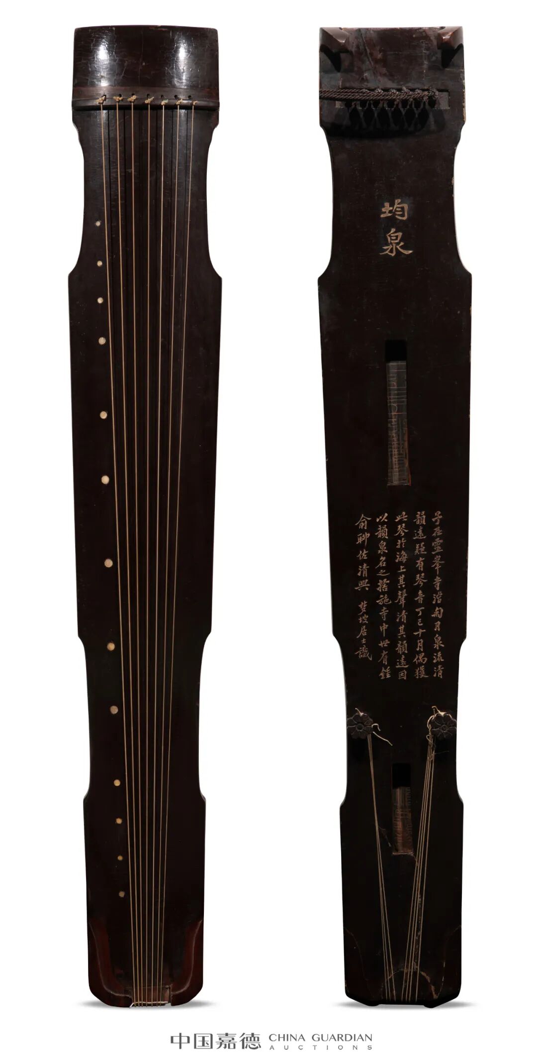 从形制上看,这是一张仲尼式古琴,髹黑漆,琴肩窄秀,琴身线条简捷流畅,含蓄而大方的造型体现儒家中庸内敛的思想。