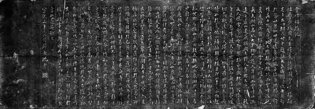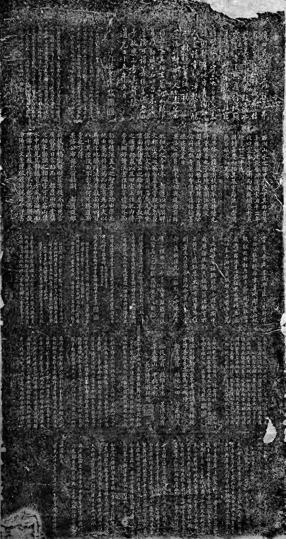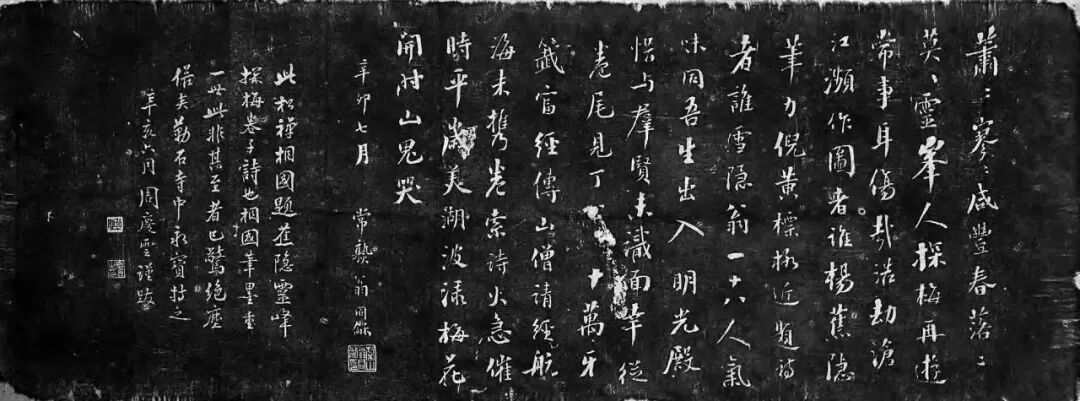 当年固庆植梅后,灵峰成为文人雅士赏梅之胜境。周庆云手中的这张卷子,就记录了灵峰寺的一场雅集。咸丰己未(1859)上元后二日,时人陆小石邀陈觉翁、汪铁樵、魏滋伯、高饮江、罗镜泉、诺庵等十八人小聚灵峰寺,由杨振藩(蕉隐)绘水墨山水,装长卷,何方谷题“灵峰探梅图”五字,各人皆有题咏,如陈春晓的诗:“古刹空山里,苍茫别有天。云容兼雪意,竹外与梅边。花发寒犹早,僧狂醉俗颠”等等。此卷先藏于灵峰寺中,咸丰庚申、辛酉(1860-1861),杭州先后两次被太平军攻破,灵峰的梅花与庙宇毁于兵燹。幸好陆小石之子陆有壬(似珊)将《灵峰探梅图》携至东粤,才逃过此劫。三十多年后,似珊退归,又将此卷舍施寺中,以证香火因缘。此时,主持灵峰寺的山僧莲溪兼主萧山隆兴寺讲席,航海请经,携此卷至京师,故卷中题咏有不少名公。其中有近代史上著名的书法家、政治家,同治、光绪两代帝师翁同龢(松禅)的题咏:“萧萧寥寥咸丰春,落落莫莫灵峰人。探梅再游常事耳,伤哉浩劫沧江濒。作图者谁杨蕉隐,笔力倪黄标格近。题诗者谁雪隐翁,一十八人气味同。吾生出入明光殿,惜与群贤未识面。幸从卷尾见丁公,十万牙鉴富经传。山僧请经航海来,携卷索诗火急催。时平岁美湖波渌,梅花开时山鬼哭。”翁同龢并未到灵峰,却为《灵峰探梅图》及其流传身世所感。这首题诗后来被周庆云连同自己的题跋一同勒石寺中。其题跋为:“此松禅相国题蕉隐《灵峰探梅图》卷子诗也。相国笔墨重一世,此非其至者,已惊绝尘俗矣。勒石寺中,永宝持之。”现碑存于杭州植物园陈列室。