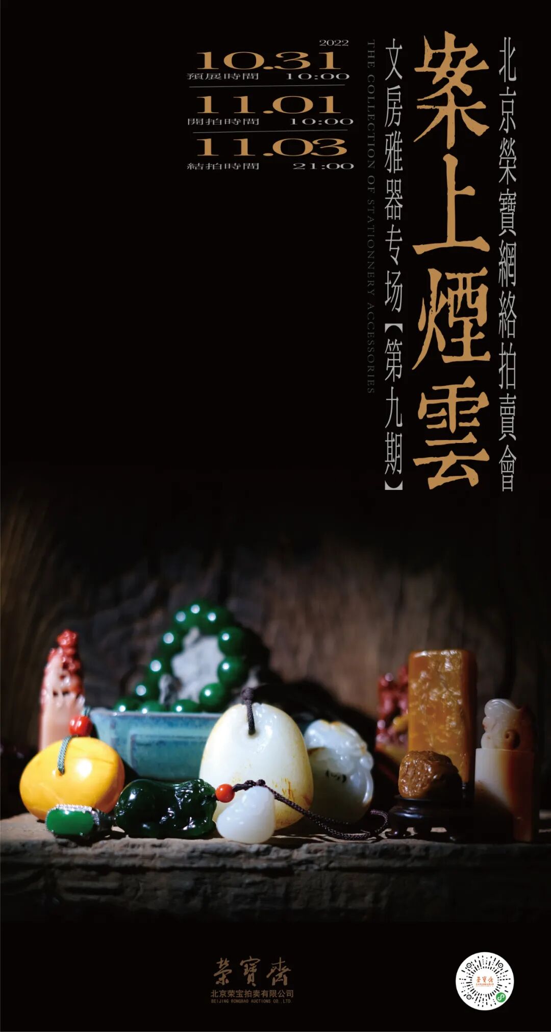 北京荣宝——案上烟云·文房雅器专场网络拍卖会(第九期)将于10月31日10:00-11月1日10:00开启线上预展,并于11月1日10:00开拍,11月3日21:00结拍。