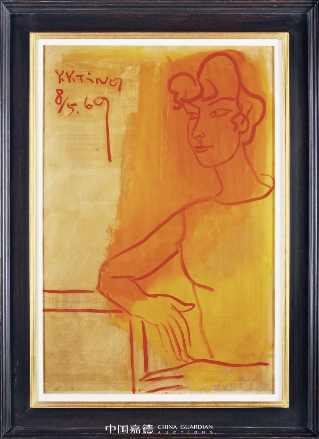 面对时代的变迁,丁衍庸具有敏锐的洞察力以及作为艺术教育家对艺术改革的愿景,其孜孜不倦,探寻中国艺术未来之出路。自1965年开始,丁公开始创作肖像画作,尤喜为学生绘画肖像,本作《橘色仕女》中雍容的女士应为丁公之重要门生。人物外貌的写实与否在丁衍庸后期创作中并不重要,他尝试发掘的实为画中主人翁的内在的精神,及中国传统对人物画所讲求的“传神”,《橘色仕女》便是绝佳代表。在本作中,丁公以明丽却轻透的藤黄铺底,背景中上方再以疾驰的大笔触上下纵向涂刷,轻松地暗示室内光线的走向,后以单纯的橘色线条精准而快速地勾勒出女子轻靠桌面,端坐于画面右方的神态,后方斑驳有力的笔触与人物精緻立体的面容形成了强烈对比,以极为率性的元素简要交代、对比出了人物与空间的关系。画面中强烈的色彩饱含视觉张力和情绪的抒放,表现出野兽派马蒂斯对于视觉美妙的单纯追求,然而流畅的简笔线条,成竹在胸般地一气呵成,短发女子的俏丽五官、端庄气质以及娴雅的姿态便跃然画面,兼具造型和结构双重功能,尽显大师功力。构图揉合东方对于“留白”以及“落款”的讲究,背景看似空阔,实则预留了题签位置一併入画,丁衍庸将签名与日期的数字灵活转化为视觉符号,成功平衡并完整了画面构图,这种别出心裁的画面设计在丁公作品中屡屡可见,而本幅《橘色仕女》可谓表现地最为精妙者。谈锡永曾说:“马蒂斯归马蒂斯丁衍庸归丁衍庸。”丁氏的线条来自于书法与金石的训练,并对其内涵心领神会。丁氏在20多岁时就定下清晰而明确的艺术理想和探究的对象,即将野兽派马蒂斯的率意笔致、八大山人为代表的大写意传统与象徵原始审美意念的古代玺印相结合,《橘色仕女》将东方绘画精髓与西方创作技法揉合,将丁衍庸一生的艺术追求淋漓尽致地展现出来,以简御繁,人物明丽雍容,自在传神,可为其独树一帜的艺术创见与鲜明风格的大成之作。![]()