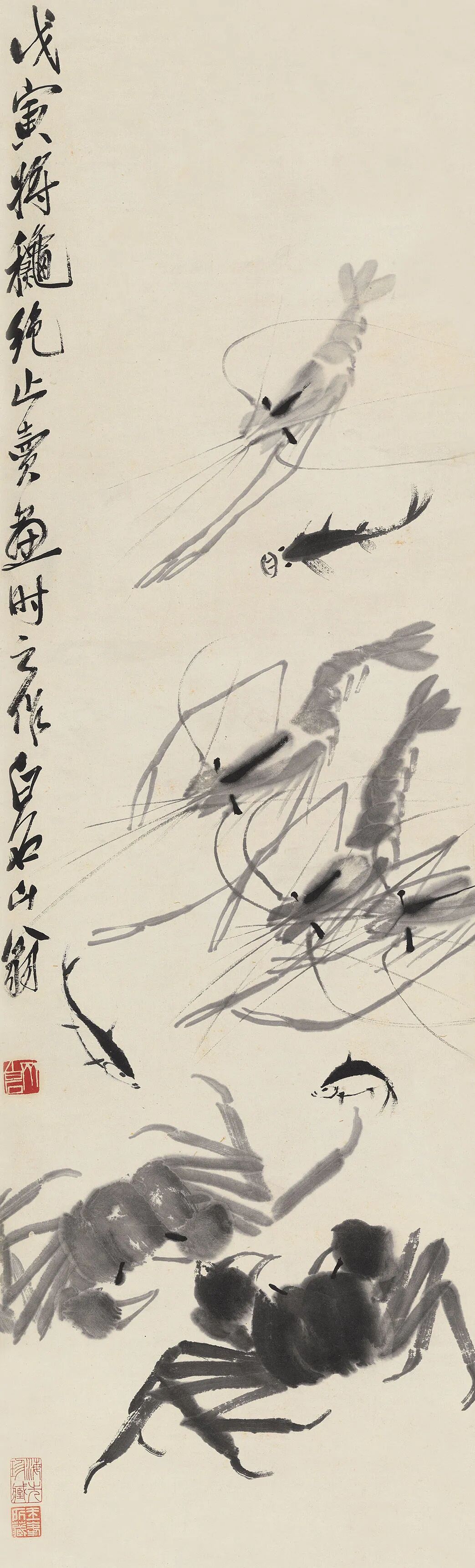 白石老人的水族鱼虫之所以动人,笔墨工夫的锤炼是一方面,天性之颖悟也是一方面,最主要的,是有赖于白石老人体内奔腾着生生不息的生命能量;这点在白石老人晚年的作品中感受更强烈,那些笔触,让人联想起毕加索在油画布上的激情挥洒,看来中西艺术,境界越往高处越相似。此本看似满幅鱼鳖虾蟹一群水族,实则是满纸飞动老辣的线条和沉雄壮美的墨团,笔墨气息流动恍若起舞,正是白石晚年愈发蓬勃旺盛的生命力的写照。