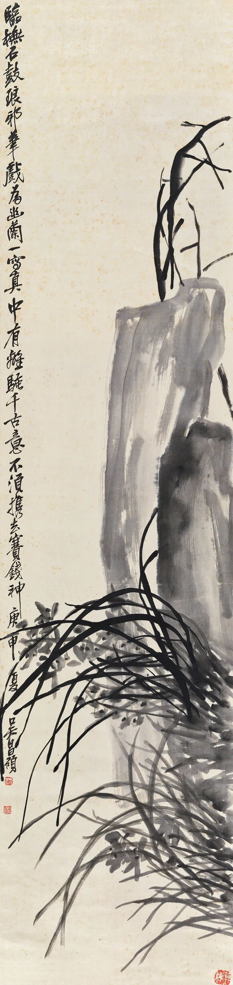 缶翁作画,按其自语,始于五十岁之时,曾云“余三十学诗,五十学画”。作丹青之初,缶翁多以兰、竹为本,一是因为兰竹气格标高,是千百年来中国文人士大夫精神、人格的最佳自喻,二则因兰竹之画法、画理与书法同源的技法界定,使极为熟悉毛笔书写特性的传统文人易于进行书法和绘画自如转换。这亦是中国古代文人由书入画时多取兰、竹为母本的重要因素。对于缶翁而言,除上述两个原因外,兰、竹更是展现其金石篆刻功力的最佳物象载体。便如本幅纯以水墨为之的《幽香》,画左缶翁长题中就言此画就以石鼓琅琊笔意写之。画中怪石占据近半尺幅,石下作幽兰。石、兰的造型布局颇似其字之结体,左肩落下,右肩耸起,以斜势构局,画与字取势一致,峻险雄奇中又有平稳安然之意。而叶、干、草、花之拨、挑、抖、顿的落墨行笔,又全都能从左侧极具金石味儿的行草长题中找到对应的行笔法则。字与画的交相呼应,相互生发,是为书画同源的直观讲解和典型范本。