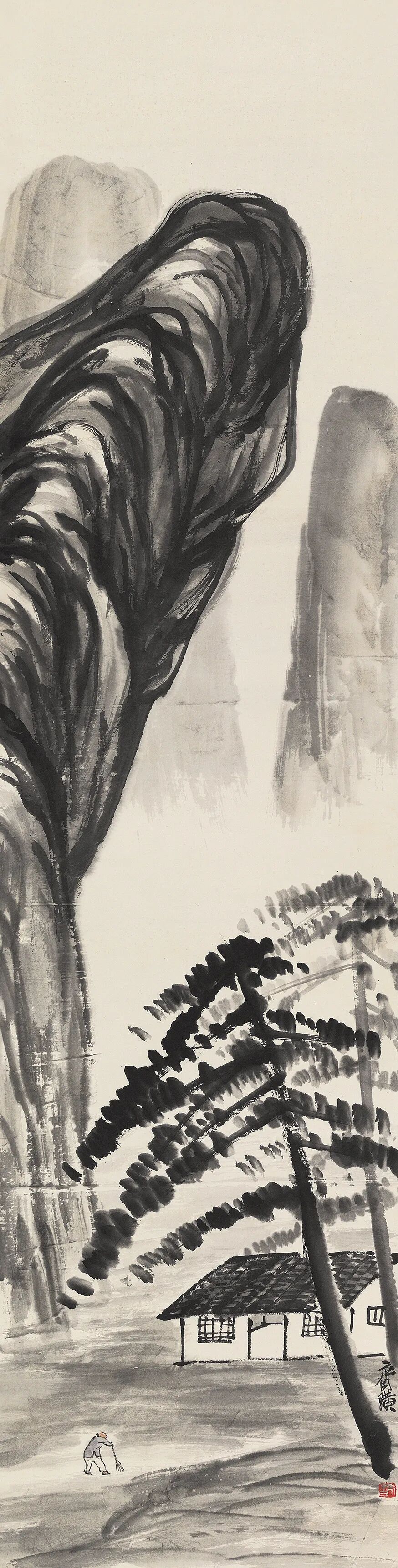 白石翁历经社会动荡,时人诸多向往和平安定的生活。齐白石借笔下清幽静谧的田园小景,将此种感受朴实淡然的表现了出来,画外之意跃然纸上。用高度简括的波浪线性起伏描画出山头远景,又用近山下的茅屋、正在打扫的老人构成了农家小场全部的院景。简洁凝练的构图,足以将生活清平明净之意表达的直接和朴拙。
