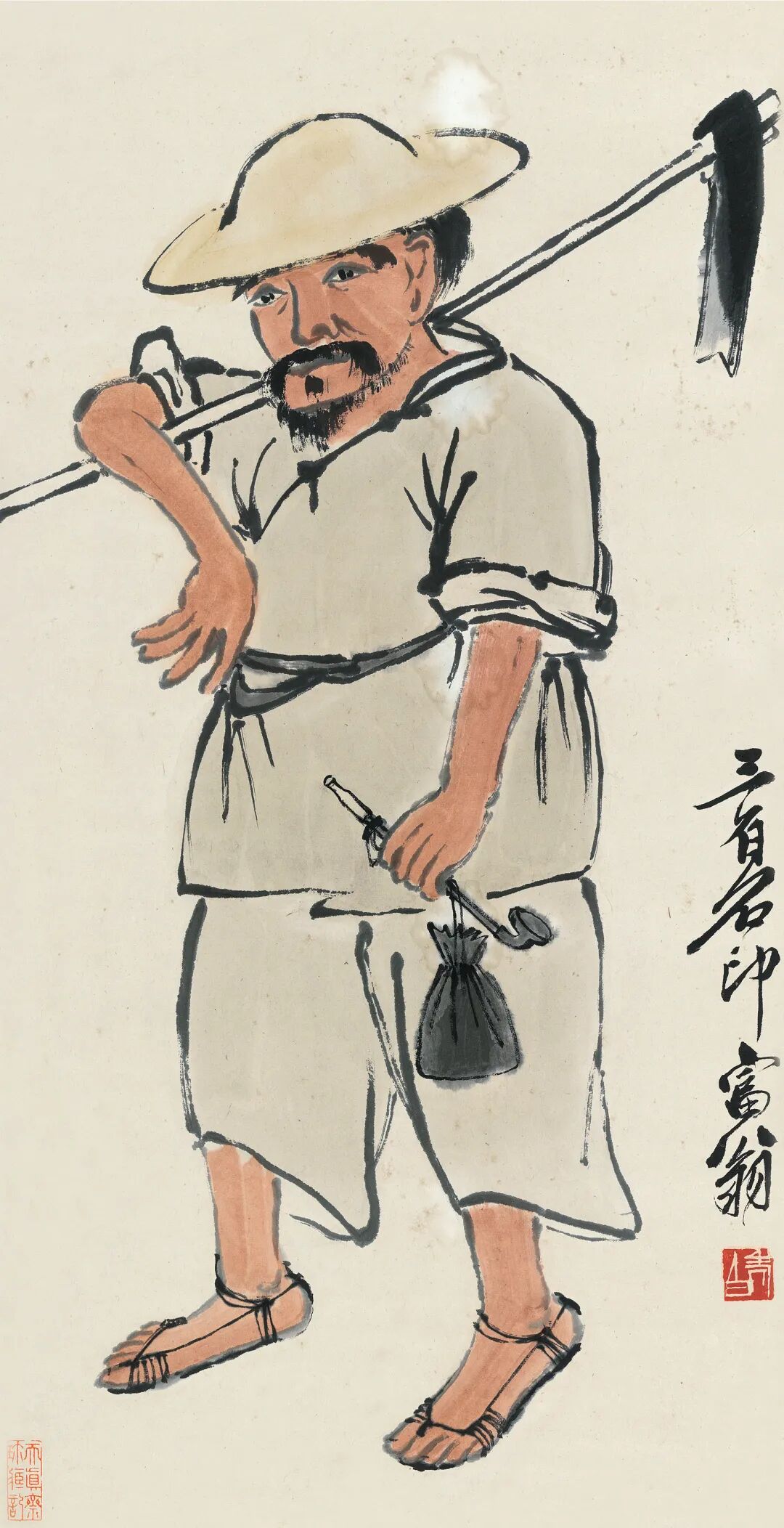 此《岁稔年丰》中的老翁从表情神态到动作举止皆稚拙纯朴,平和慈祥,可以说都是“民间味”意涵的具体呈现。原本这些是传统文人画视之为小道的冷门,却让齐白石抬上了文人雅趣的台面。乍看其貌不扬,细看来笔墨精湛简约,传神生动,功力深厚、意趣盎然。虽用笔减省,却不乏善良、朴素、睿智、幽默!此作不只借鉴于前人和民间艺术,也得之于对生活观察和自我个性的表达,更得之于其在创作中反复推敲、再三修改的艰苦用心和惨淡经营。是白石老人体会生活,观察生活之结果。
