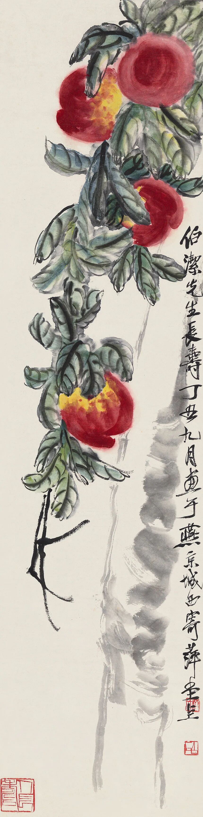 汉代东方朔《神异经》记载:“东北有树焉,高五十丈,其叶长八尺,方四五尺,名曰桃。其子径三尺二寸,小狭核,食之令人知寿。”寿桃寓意吉祥,历来为人所喜爱,作为长寿的象征,常入画,此类题材的画作亦常被用作寿诞之礼,故而寿桃在白石老人笔下的演绎也极为精彩。