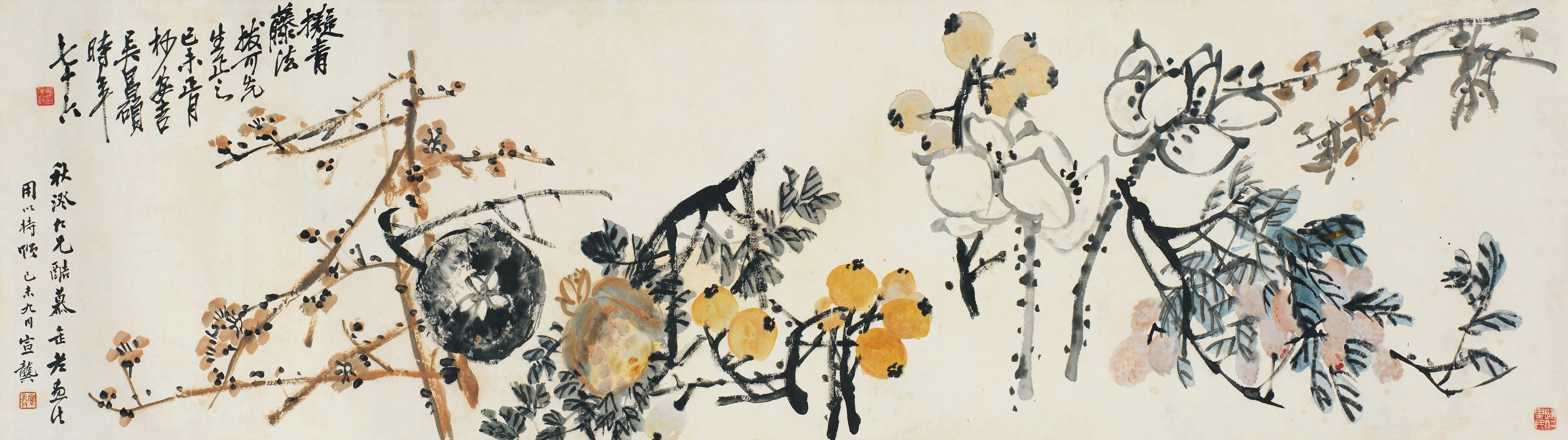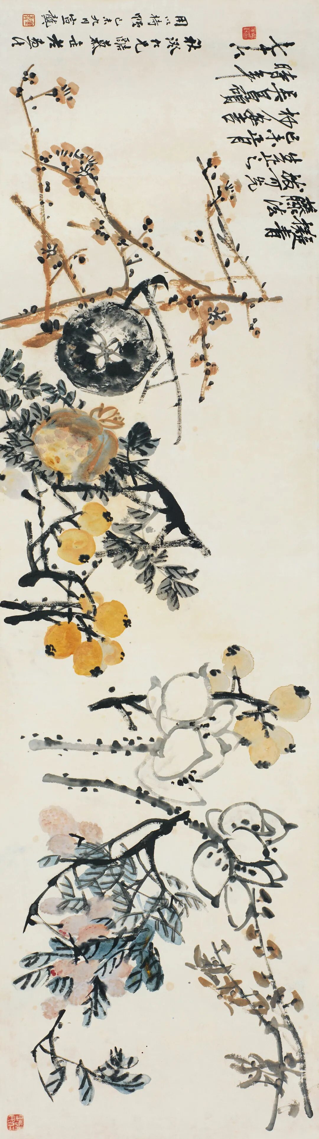 缶翁是大器晚成的典范,《春华秋实》作于1919年春,时吴昌硕七十六岁,正值其书、画、篆刻艺术炉火纯青的阶段。所绘兰花、荔枝、荷花、枇杷、石榴、梅花,皆其平日最为精擅之题材,故写来畅顺无滞,任意东西而风神独具,从中可看出吴昌硕于花果类超强的造型能力。