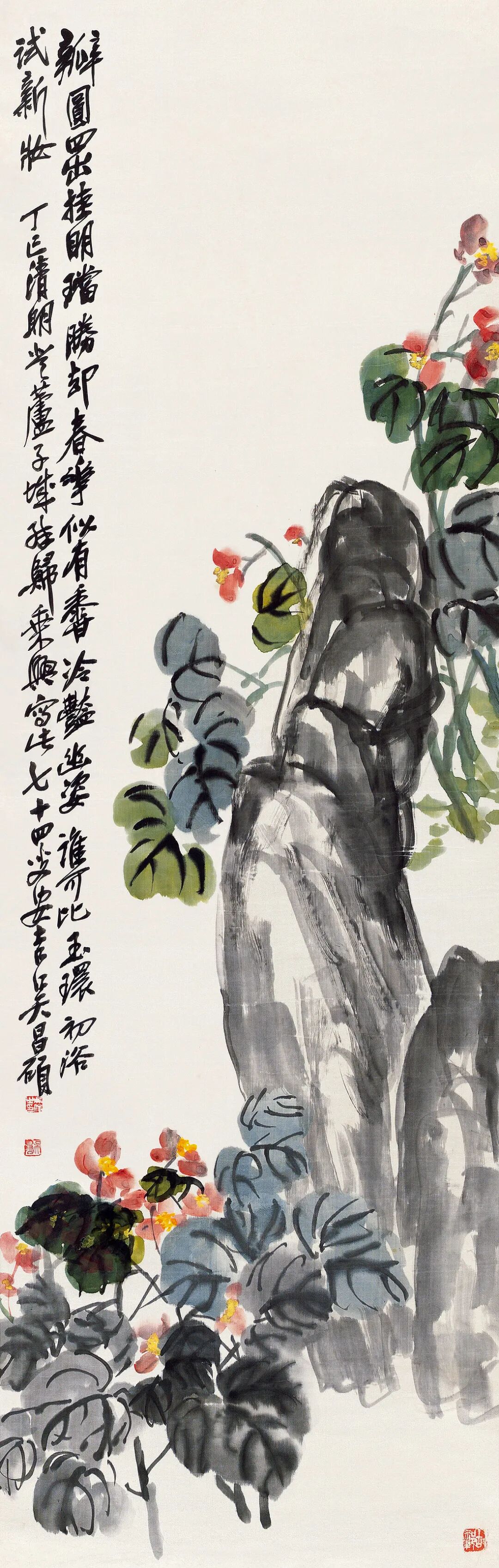 《寿石新妆》作于1917年清明,画幅左下角置三株秋海棠,叶片以没骨淡墨成形,浓墨勾勒筋脉,红、黄点缀花瓣、花蕊,色彩艳丽,枝疏而叶茂。右上紧邻一柱苍石,凌空直上,几占画幅一半,与下方秋海棠形成强弱欹侧的对比,笔力苍劲,墨气淋漓,立全作之气势。而石后冒出另丛秋海棠,婆娑妖娆,攀附石上成裹挟之姿,细茎片叶的柔媚顿然中和巨石的强势,柔并济。左上留白处,两行题识笔直而下,一气贯通,既补足画面,增添骨力,又撑住画面略向左倾的态势。右下角的押角印,与题款遥相呼应,构形定气,逸兴未尽。吴昌硕自言此为醉归后作,诗情画意勃发,乘兴写成,其章法布局,任意点缀,又无懈可击,笔墨洒脱,是画家纯熟功力与深厚学养的自然流化。