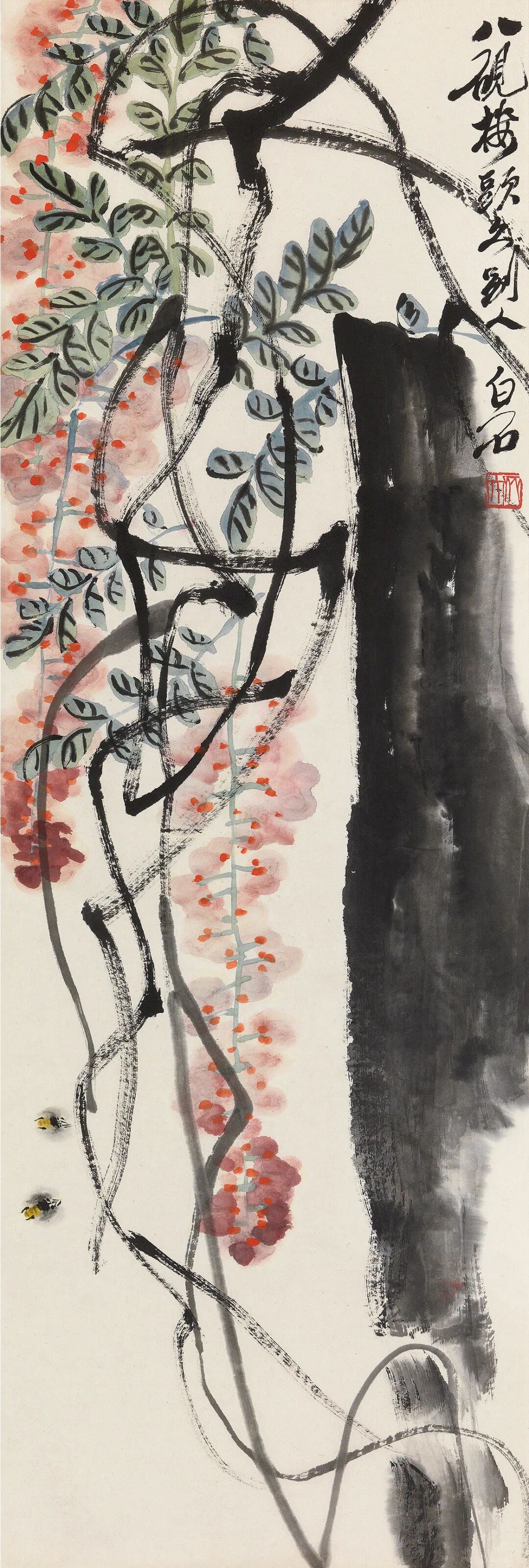 此作白石老人以篆书笔法用焦墨写藤条枝干,蟠曲环绕,遒劲有力,形乱理顺;在藤萝的花卉和藤叶的描绘上,则不拘泥于自然界的客观事实,用花青、藤黄调墨写藤叶,以洋红调些许花青画藤花,使色彩比大自然中的藤萝花卉更加淡雅,却又不失鲜艳,更衬托出藤叶之绿嫩。藤、花、叶三者协调一致,更显格调高雅,色彩绚烂。用大块浓重笔墨置一柱石于画面右侧,虽大不堵,为黑不死,几根苍劲的藤条虽倚绝壁倒挂而生,却开出娇嫩、艳丽的花朵,正所谓“悬崖倒岛逢生根,开在群花最上层。自有垂天好香色,不同广地汉家藤”。两只小蜜蜂,为画面增添了无限的生机与动感。