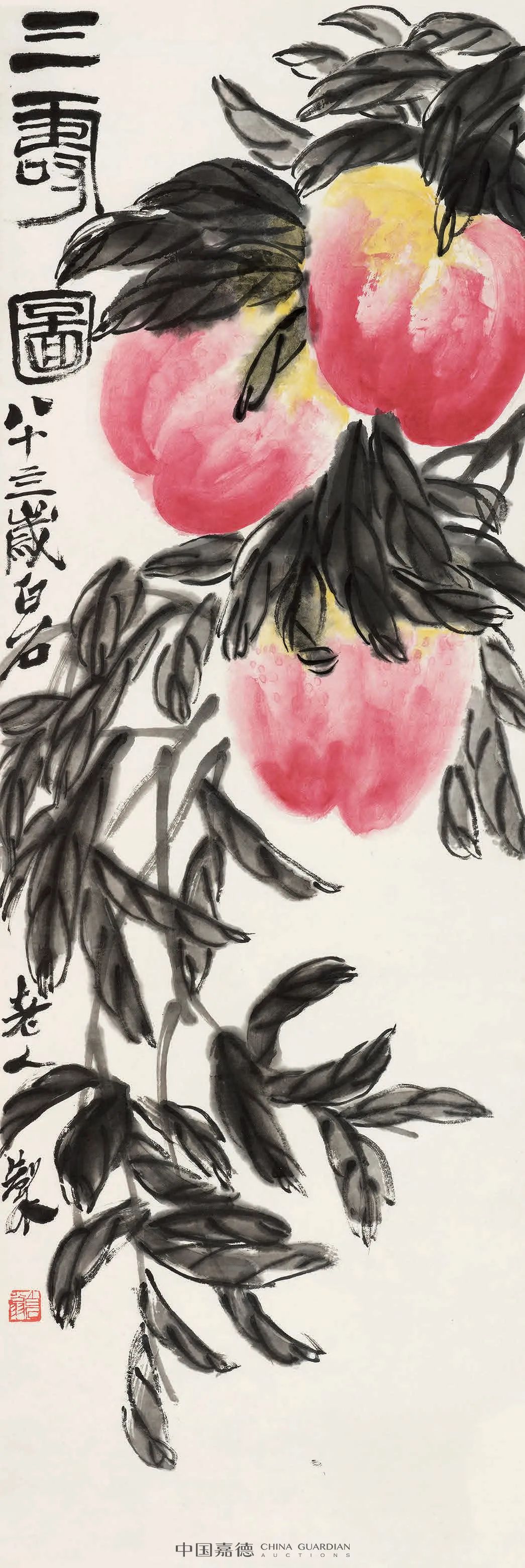 题识:三寿图。八十四岁白石老人制。