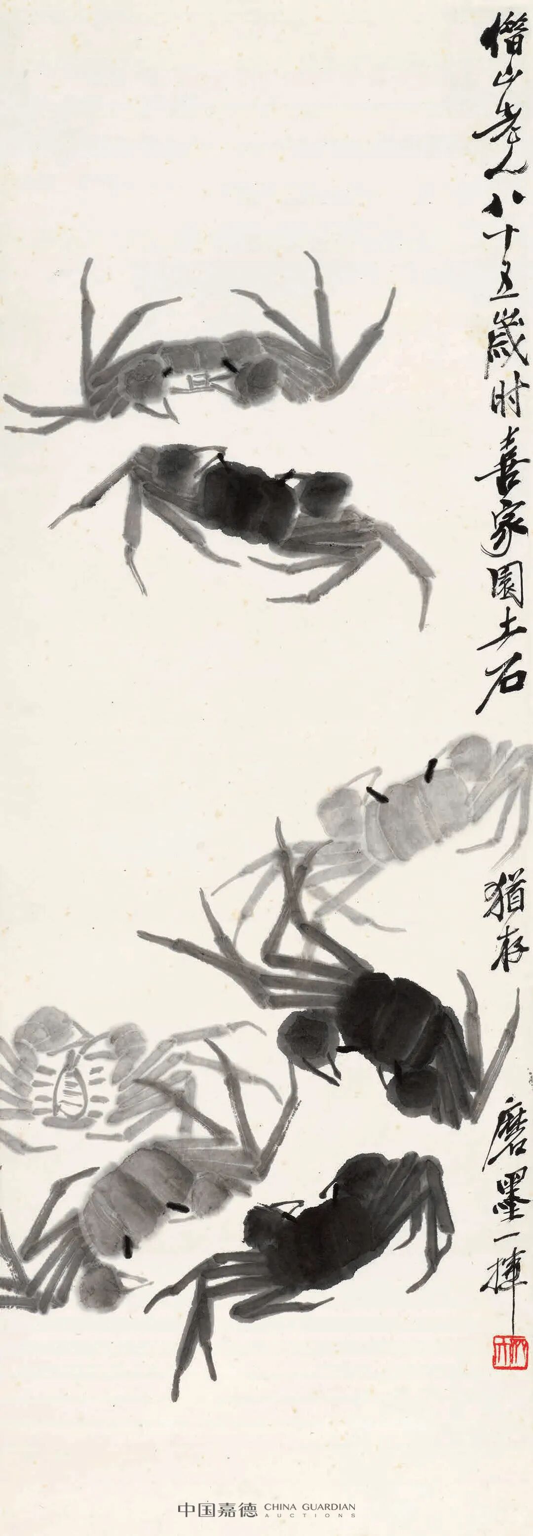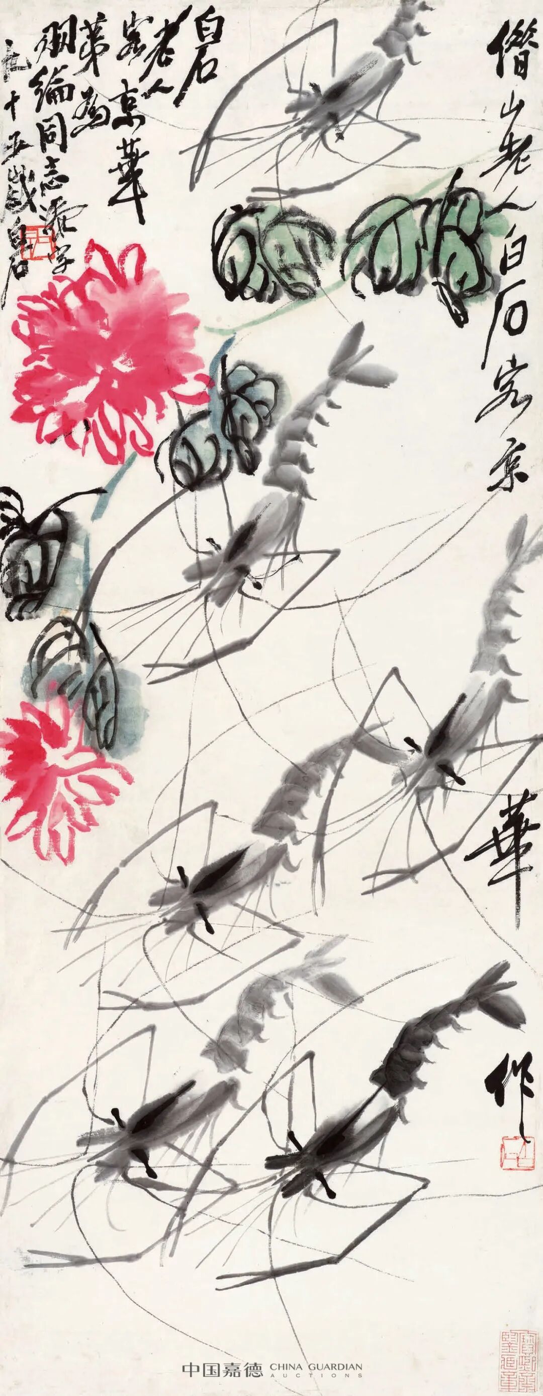 齐白石生平喜画虾,曾将虾养于笔洗之中,悉心观察。齐白石云及绘虾之变曾有言:“余之画虾已数变,初只略似,一变毕真,再变色深淡,此三变也。”经此三变,终于成就了齐白石笔下最具个人风格的绘画题材,愈至晚年,白石老人笔下的墨虾,愈见提炼概括。这也正是齐白石所追求的“妙在似与不似”的创作理念。墨虾于宣纸之上,虽不饰水纹波浪,仅仅通过造型的表现,亦觉群虾游动之动感,可谓写意画的高妙之处。画毕群虾,又添红菊一枝,画面立现与众不同。菊花于群虾的游向归于统一,此作后相赠翻译家陈羽纶,耄耋之年的白石老人为其题写上款,将画面左上的空白填满,营造出上密下疏的视觉效果。此时白石老人书风已入化境,结字长枪大戟,自由挥洒,人书俱老。书至“客京华”,或云第某年,又转念题写“为羽纶同志添字”,归于平淡天真。