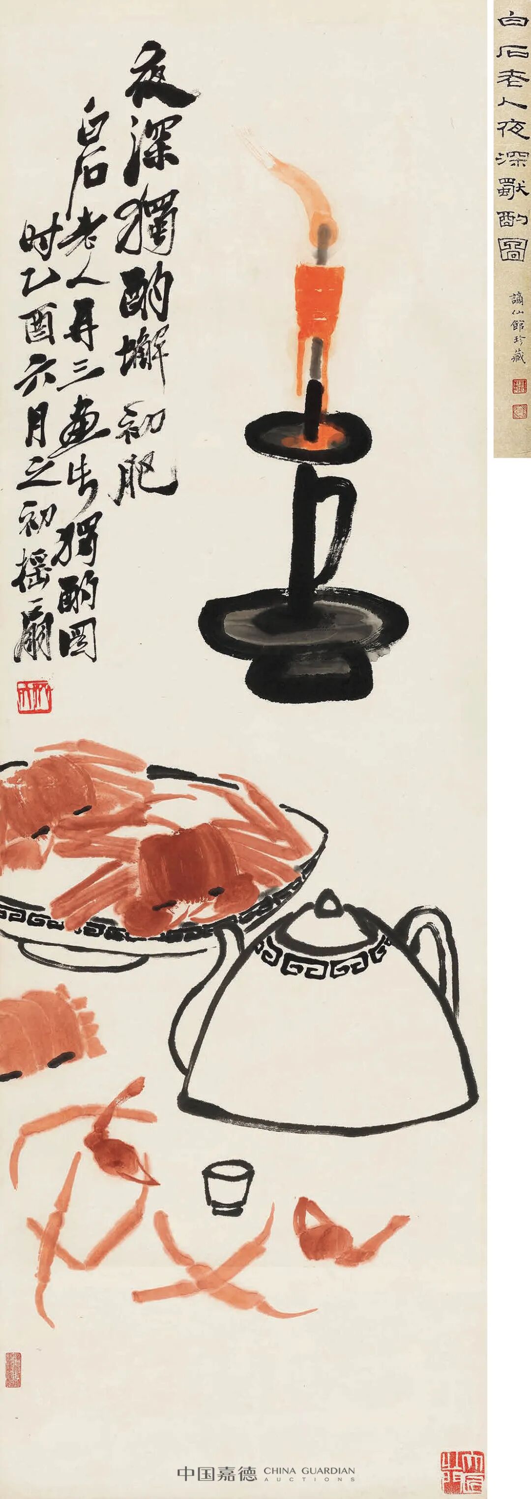 签条:白石老人夜深独酌图。谪仙馆珍藏。钤印:谪仙、凡