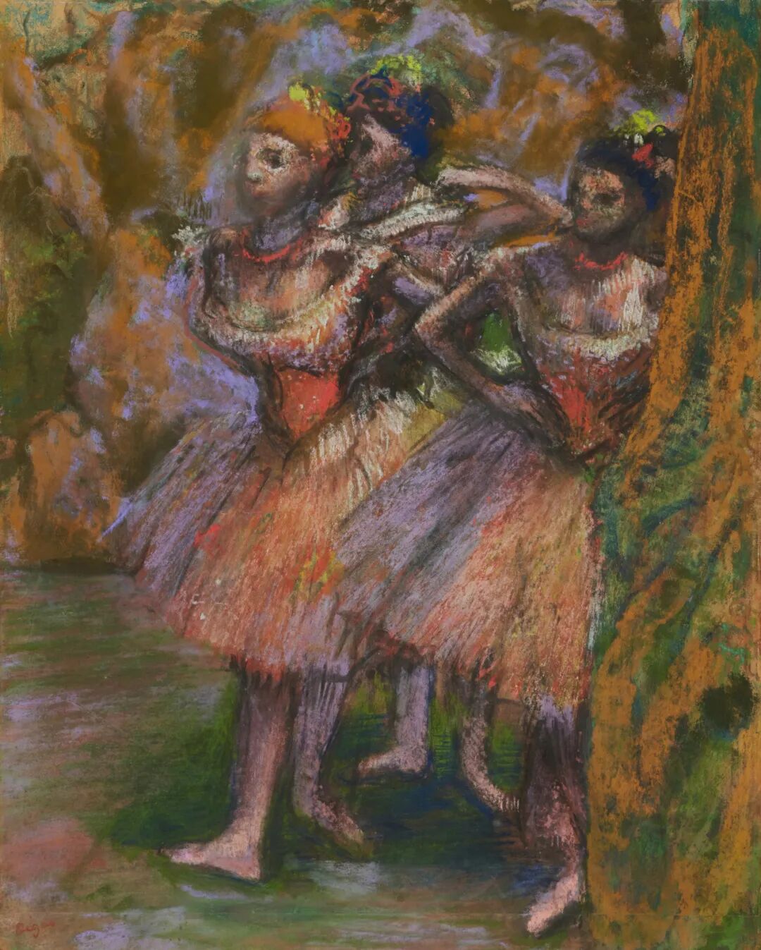以亮丽的色调描画出主角温柔的形态,埃德加德加(Edgar Degas)的《三个舞者》反映了艺术家其中最具标志性和永恒的主题:芭蕾舞者。一开始德加都是描绘在台上的舞者,后来渐渐捕捉她们在观众目光以外的小时刻。本作中德加通过大胆鲜艳的色彩进一步发展这主题;虽然艺术家继续以细腻的方式渲染某些细节,如舞者的服装,但其他元素包括周围的舞台,则预示了艺术家以后以抽象形式为主的创作发展。