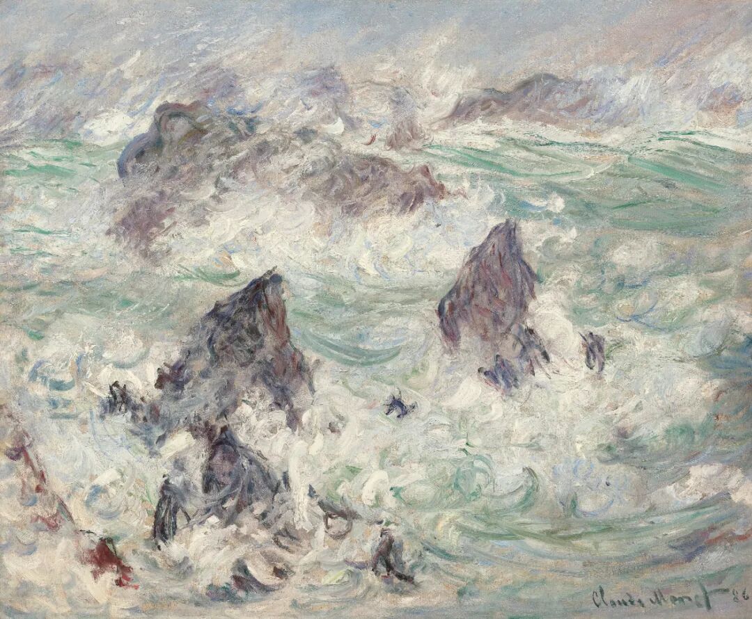《贝勒岛的风暴》是1886年秋天莫内游历贝勒岛(Island of Belle le)蜿蜒的布列塔尼海岸(Brittany)时所创作的油画作品。莫内以往进行野外绘画是通常都只是将对景色的初步印象纪录下来,其后都将作品带到工作室再作修改;而本作的构图及细节处理却是艺术家现场即时进行——汹涌卷曲的海浪和几乎消失的地平线,都说明了莫内如此精细的捕捉了狂风暴雨的天气。