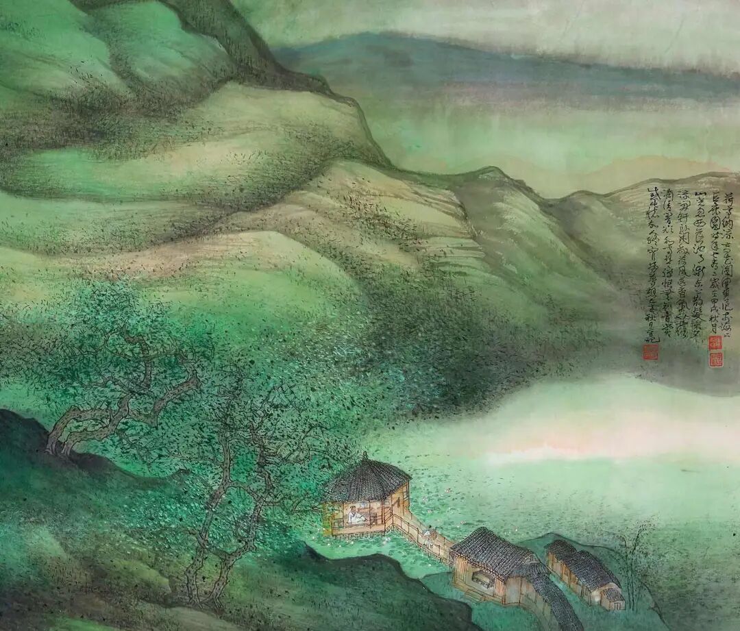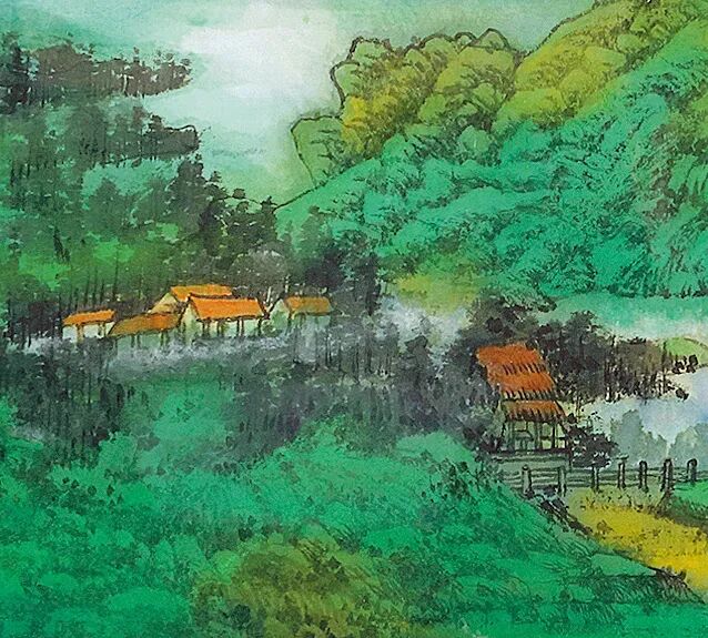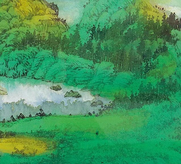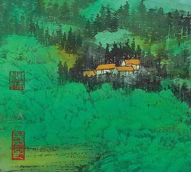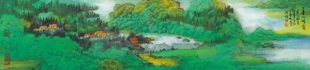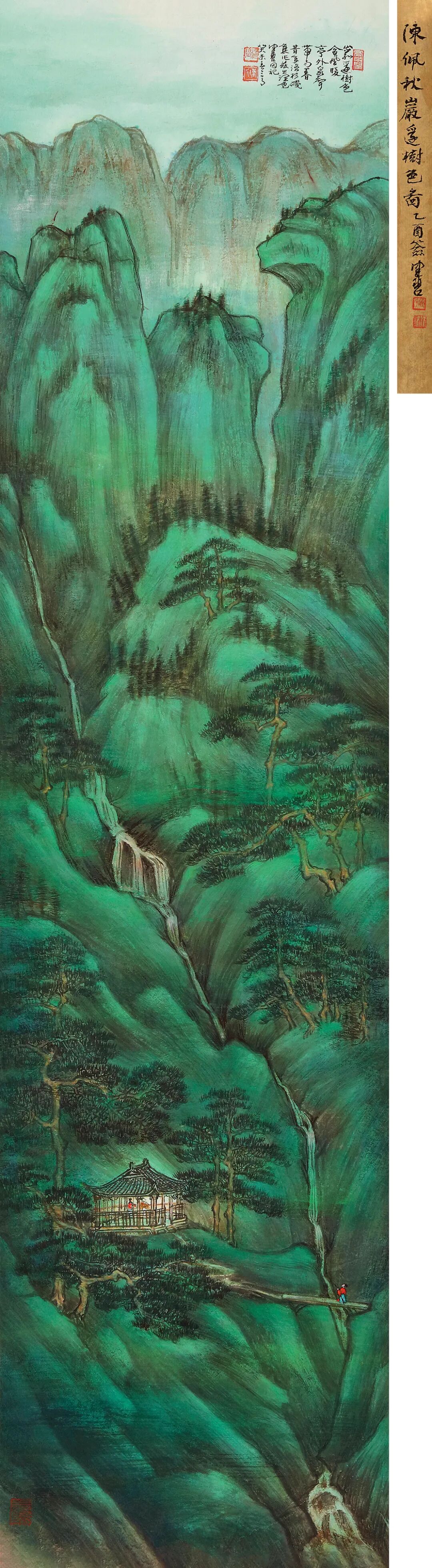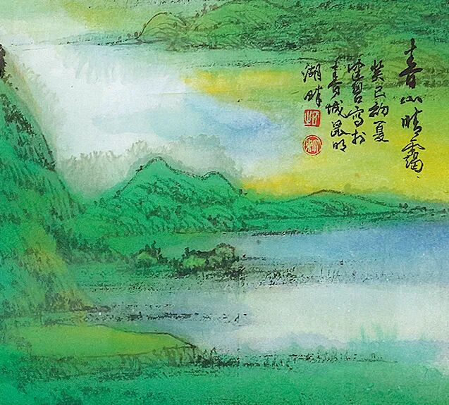 题识:青山晴霭。癸巳初夏,健碧写于青城昆明湖畔。