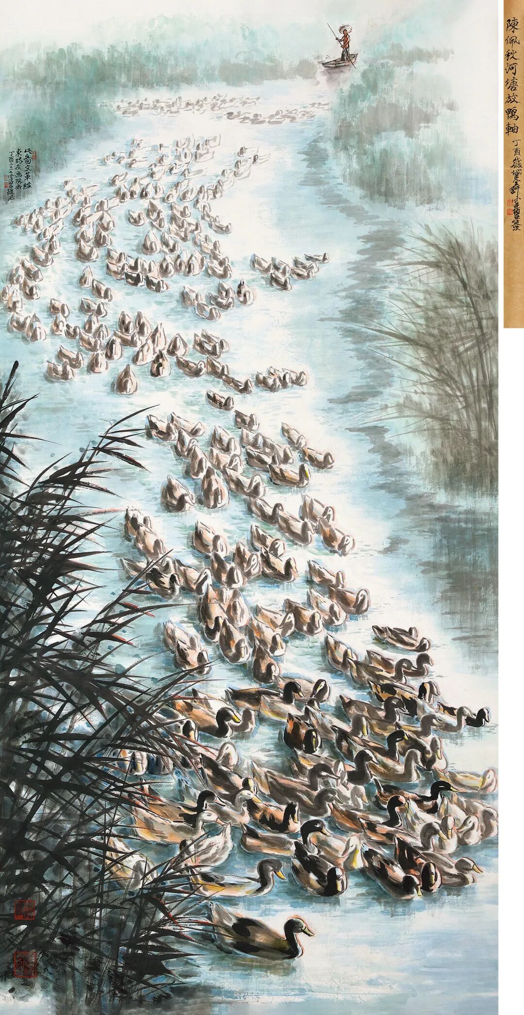 题签:陈佩秋河塘放鸭轴。丁酉岁截玉轩健碧签。钤印:陈氏、佩秋