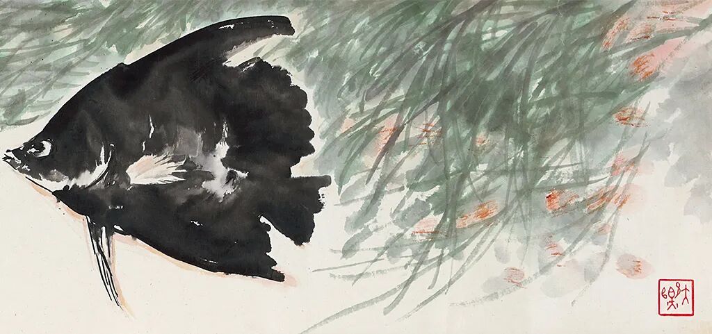题识:去岁唐药翁为德珠大姐写鱼数尾,颇得青眼,兹亦效之,以博垂顾。健碧。