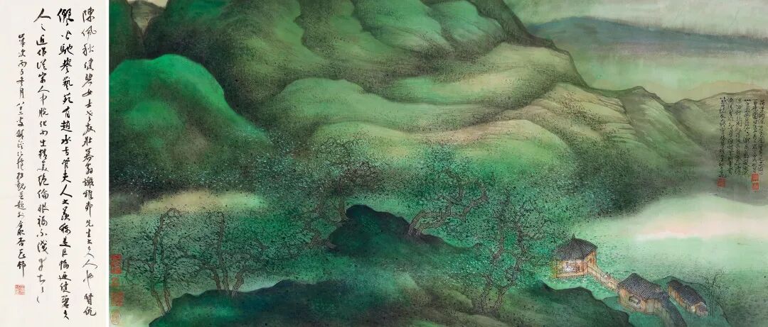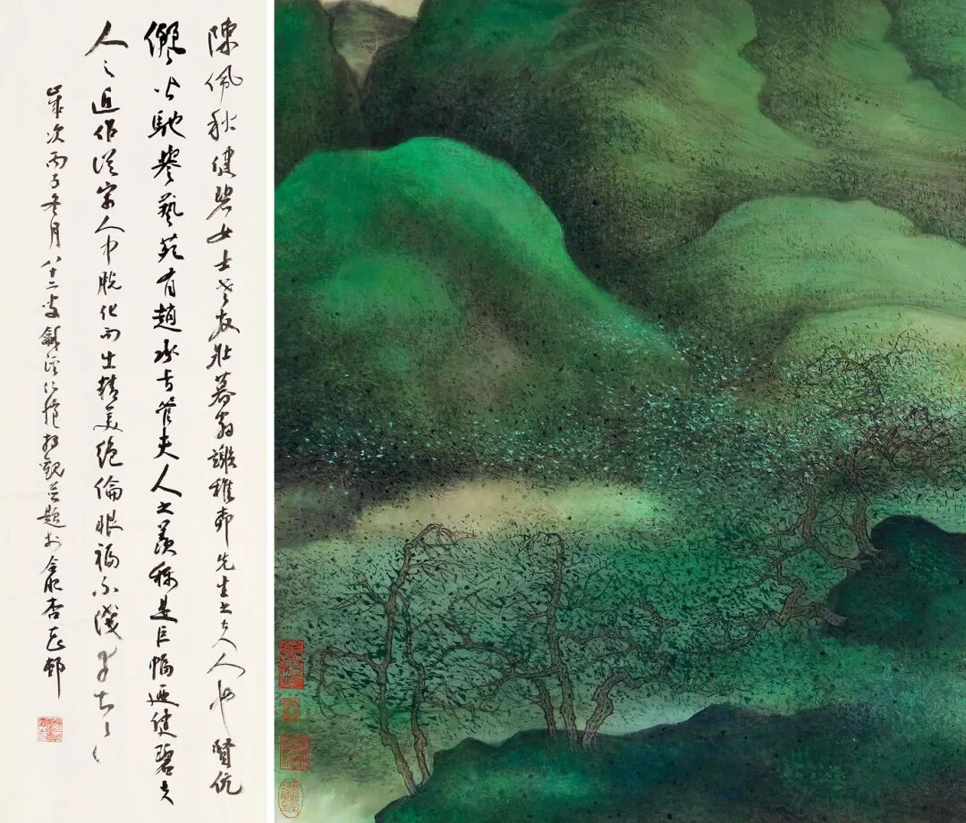 边跋:陈佩秋健碧女士老友,壮暮翁谢稚柳先生之夫人也。贤伉俪皆驰誉艺苑,有赵承旨、管夫人之羡称。是巨幅乃健碧夫人之近作,从宋人中脱化而出,精美绝伦,眼福不浅,幸知。岁次丙子冬月,八十二叟龢溪仁恺拜观并题于合肥杏花村。钤印:杨仁恺鉴定真迹之印