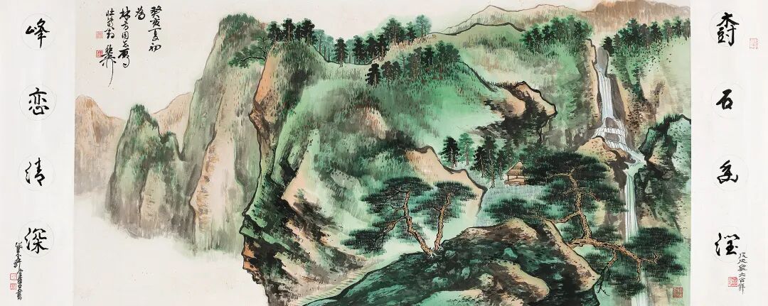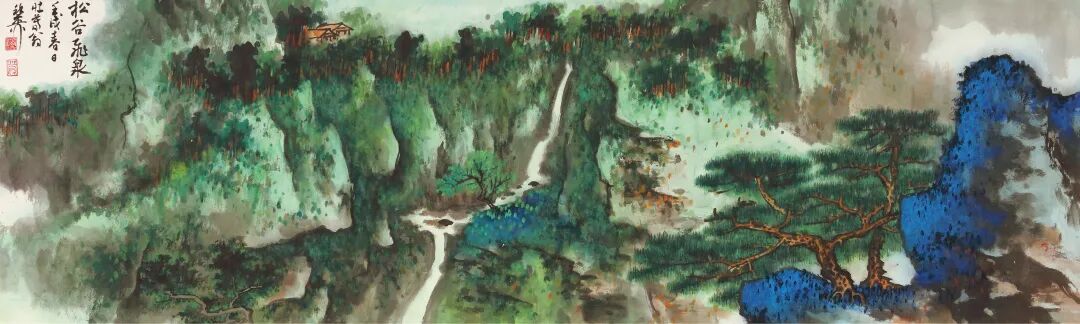 泉瀑出于两峰而下泻,以水口来活跃静穆的气氛,水流跳跃奔涌,在朴实的章法中构建奇巧,垂落的白练将观者的目光吸引到半山坪台处的小屋,红墙蓝瓦,丛林相接,引人注目,下连小径,正是可居可游之所在。