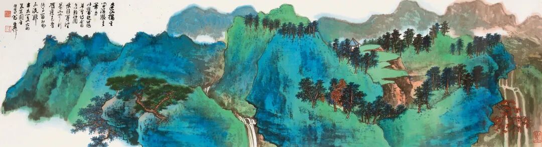 谢稚柳最初的山水画,即从宋人入手,北宋山水那种千岩万壑、高深平远的气象,决定了他一生山水的结构。此幅作品还呈现出谢稚柳1980年代中期以后绘画的一个重要特色,即进口颜料的使用。谢氏此时尤好用石青、石绿,杂以浅绛坡石、宫观、树稦等,大青大绿间,色彩感较之此前的传统颜料更加鲜明、致丽缤纷。