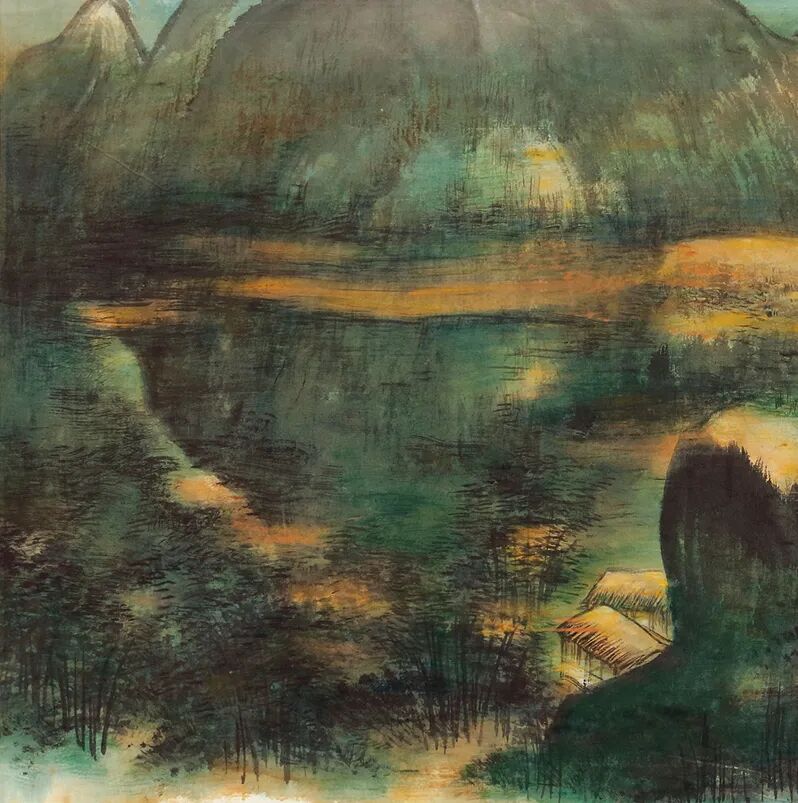 《云水山村》为谢稚柳八十二岁所作,画家将山上山下,高远平远结合在一起,几座凝重雄浑的山体映入眼帘,林木掩映,墨彩相融,白练于山前垂落,云气于山后蒸腾,于密实处见空灵,山下小屋人家数间,一片高远典雅之气。