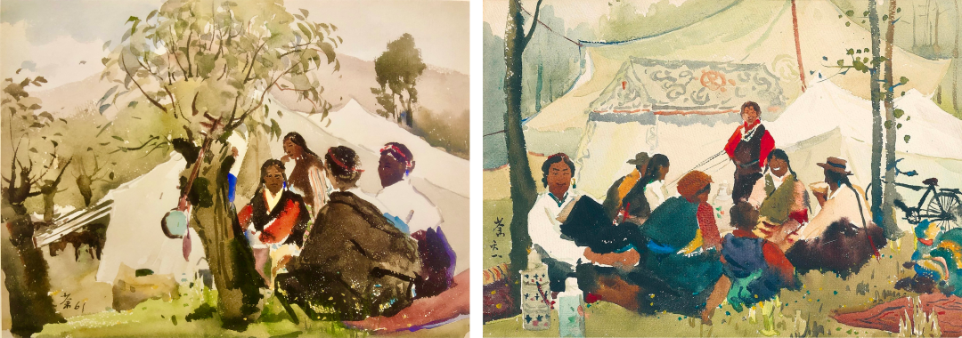 1961年7月,为了反映西藏的和平美好,时年42岁的吴冠中与董希文、邵晶坤三人去到拉萨,并分工分路找题材写生。吴冠中最初只打算专攻风景画,因为从上世纪五十年代开始,受时势的影响,他源自法国现代绘画的人物创作理念变得不合时宜,因此他的创作风向也从原本看重的人物转向以风景为主。但刚到拉萨不久,吴冠中便遇上了雪顿节,那是预祝丰收的节日,也是西藏所有节日里最隆重、规模最大、内容最丰富的节日之一,人们要跳舞演戏,场面壮观,如此胜景也激发了他骨子里对人物创作的热情。在80年代的文章《西藏杂忆》中,吴冠中曾写道:“绿女红男,成千上万的人群奔向罗布林卡大花园……每个家庭围绕着自己的帐篷,有唱歌跳舞的,弄乐器的,闲坐喝酥油茶的……眼前就是福境,我难以抑制内心的激动,感到连挤颜料都来不及,东画西画,挟着画具到处窜,时而将背包丢在东头,棉衣又脱在西头,热心的藏胞们追着给我送还背包、棉衣,还提供我凳子、奶酪、酥油茶……我的激动感染了他们,画面逗乐了他们。”吴冠中《西藏雪顿节(一)》1964年 纸本水彩 27×38cm