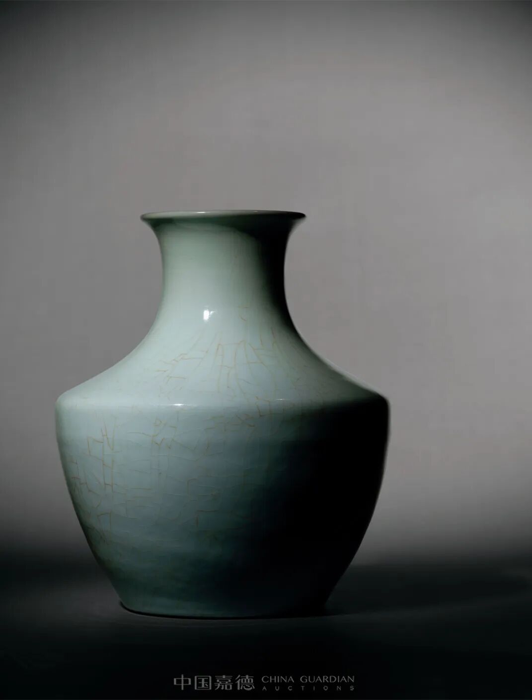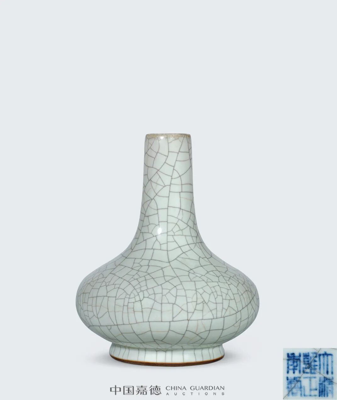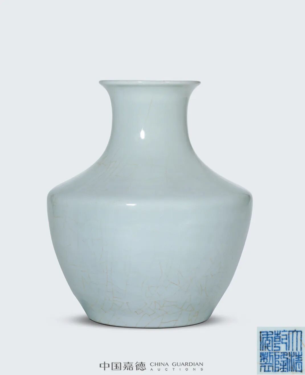 荸荠瓶为清代流行的瓶式之一,康熙时期首创,至乾隆烧造鼎盛,雍正时期官窑烧造荸荠瓶存世较少,流通者可见青花、黄地青花、青釉装饰,仿哥釉荸荠瓶甚为罕见。