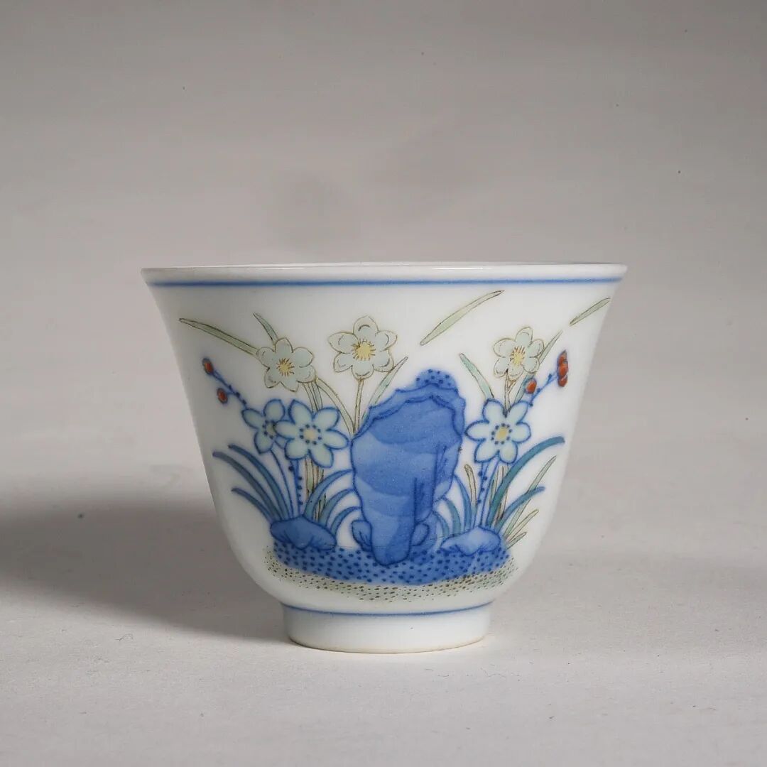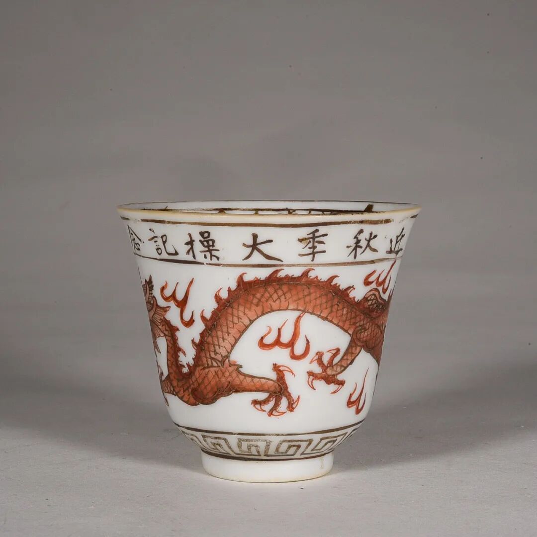 此杯撇口,斜直壁,敛胫,圈足,内口沿饰一周锦纹,杯心书“整军”二字款。外壁绘红彩龙纹,龙为四爪,胫部饰回纹,口沿书“光绪三十一年河间附近秋季大操记念”。清末清廷成立新建陆军,于光绪三十一年、三十二年、三十四年先后在河北河间、河南彰德、安徽太湖举行秋季操练,且由官窑烧制秋操杯以资纪念。