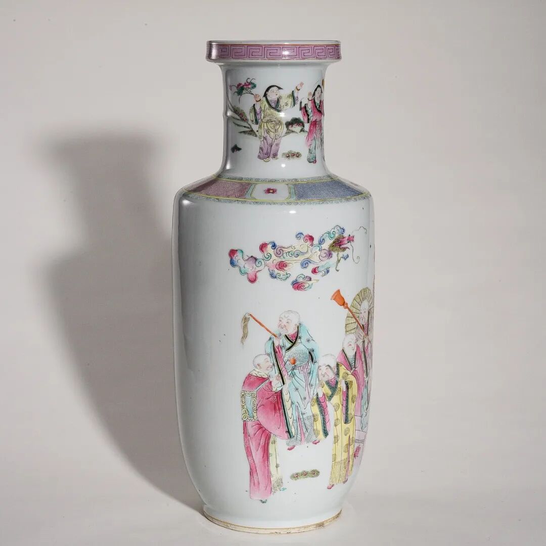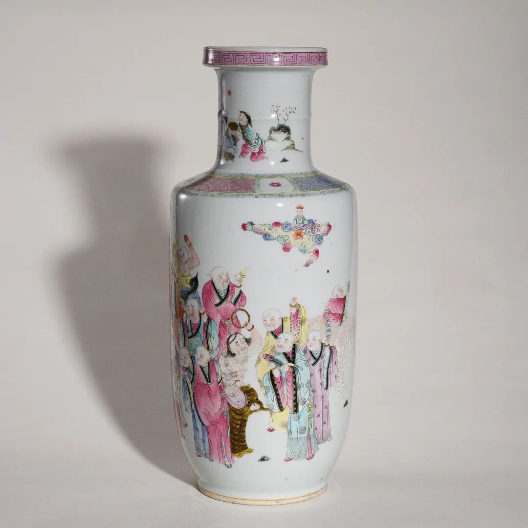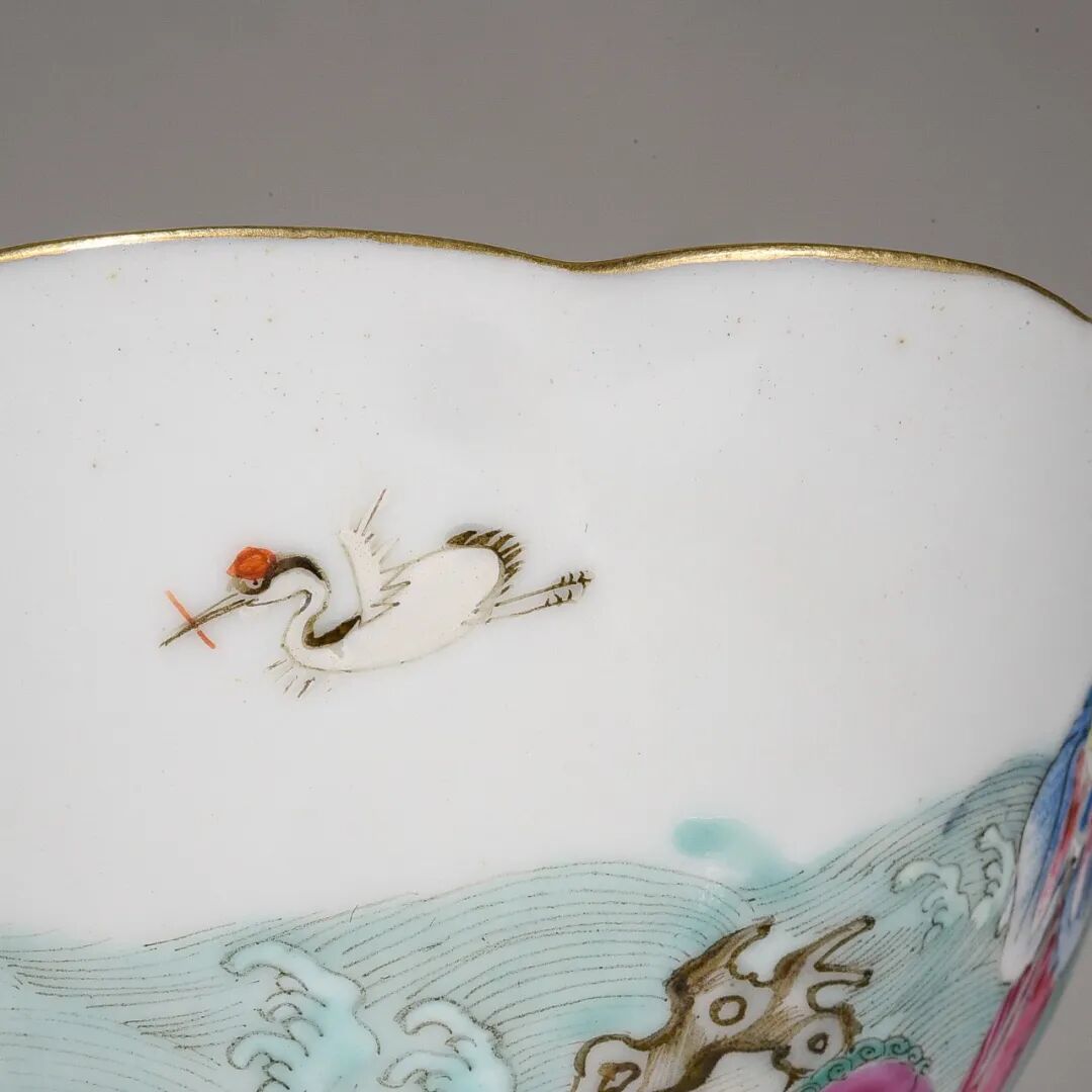仙人泛槎于在汹涌波涛中安然自若,开脸衣饰描绘细腻动人;祥云环绕高屋,仙鹤衔枝随行,又有海屋添筹之意。盖面图样为麻姑献寿,麻姑手捧灵芝,槎头花篮内盛寿桃,将长寿、如意的美好愿景带到人间;整体画面布局精妙,绘工细致,彩釉莹润,诸多祝寿添福寓意集于一身,为清中期粉彩器之佳作。