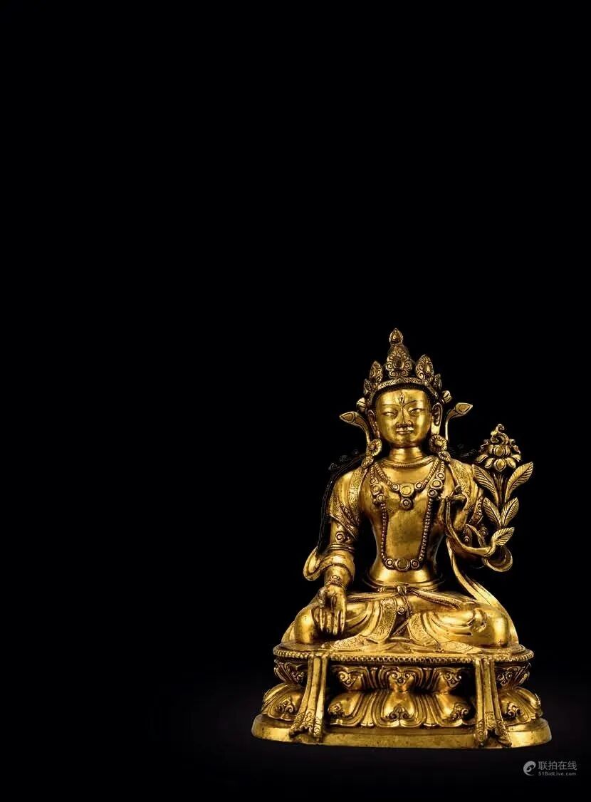 本品以瓷为胎,通体以粉彩绘饰,财臣面容饱满,五官端祥,身外有飘带飞扬,结跏趺坐,右手当胸持法器,左手下垂结法印,坐于莲花座上,尽显华丽。其下均承以高柄鼓状底座,座上端呈石鼓状,鼓面饰矾红彩西番莲纹。鼓边上部饰矾红彩变形覆莲纹,中间一周饰鎏金连珠纹,下部绘矾红彩蕉叶如意头纹。直柄作海涛翻涌状,五彩波浪错落有致。下坠葫芦瓶状包袱,包袱上饰蓝彩缠枝纹。再下有覆碗状足,分四层,分别饰矾红彩覆莲纹、西番莲纹、如意头纹。整器工艺精湛,造型灵动传神,粉彩发色亮丽,矾红彩深沉雅致,为道光一朝佛供七宝之佳品,器底署矾红「大清道光年製」六字三行篆书款。