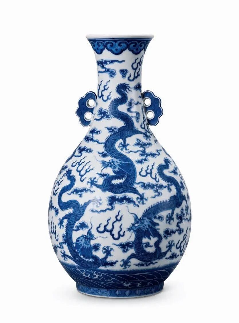 皇帝为「九五之尊」,「九五」其实是八卦里的一个术语,古人认为九在阳数(奇数)中最大,有最尊贵之意,而五在阳数中处于居中的位置,有调和之意。九龙瓶是御窑厂专供宫廷制作的陈设用器。本品虽纹样繁茂但气息清雅,所绘妍美,双耳巧饰点蓝彩状如夔龙,简约而玲珑别致。通体满绘青花云龙纹,九条威龙穿梭于祥云、火珠之间,周身环视祥云,交叠悬停,气韵生动,填彩饱满,渲染匀称,愈显得神龙腾云驾雾,皇家气势神圣不可侵犯。龙鳞成整齐的点状,龙头趋向和善,体现了这一时期龙纹的绘制特点。