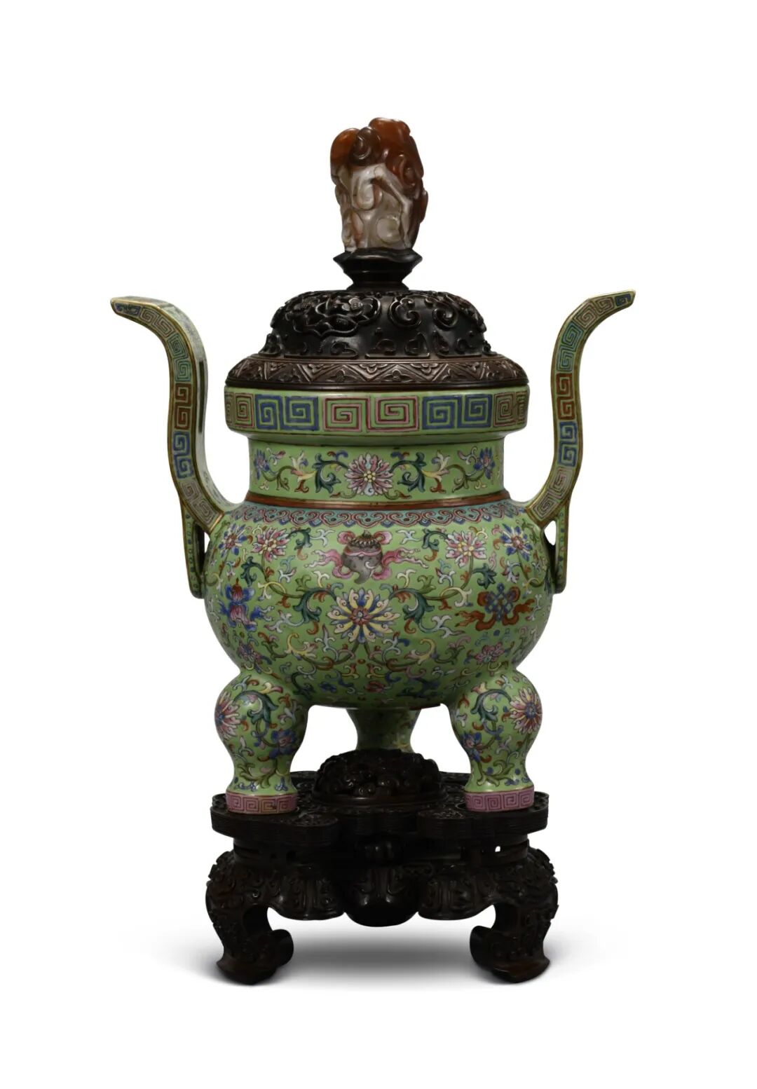 清嘉庆 绿地粉彩莲托八宝三足香炉