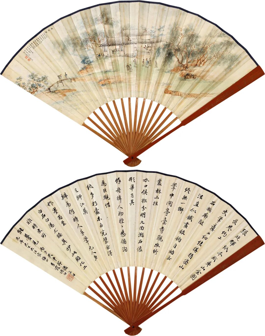 题识:1.饯别图。亢虎先生近有坎拿大之行,任审查文化艺术之责,壮哉。此游海上画家俱为祖饯,藉以送别,爰绘便面奉祝顺风,不揆拙劣尚乞教正。廿五年六月,吴青霞写并识于沪。